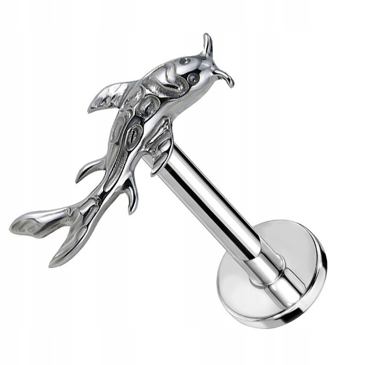 лабрет серьга со шляпкой в виде рыбки кои, полностью изготовлен из титана высочайшего качества. Рыбка кои — культовый мотив в мире пирсинга — была сделана с вниманием к деталям и будет красиво смотреться практически при любом пирсинге ушей. Вы можете носить его в форме мочки, спирали, раковины, плоской формы или козелка. Надевать эту серьгу можно с помощью нашей булавки для стержней с внутренней резьбой :) Доступен в двух классических цветах: золото и серебро.
