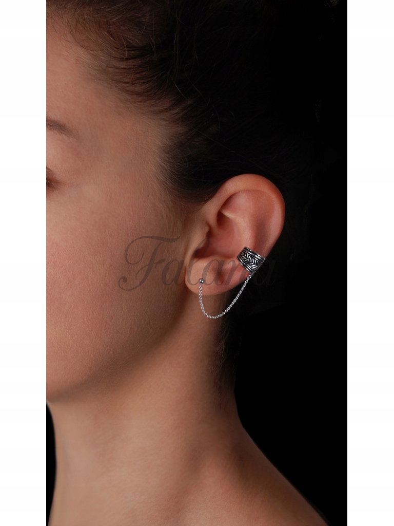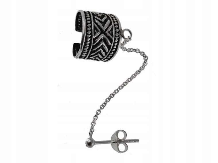 Серьга из темного серебра 925 пробы, серьга на цепочке, прикрепленной к традиционной шпильке с барашком. У украшения интересный узор.