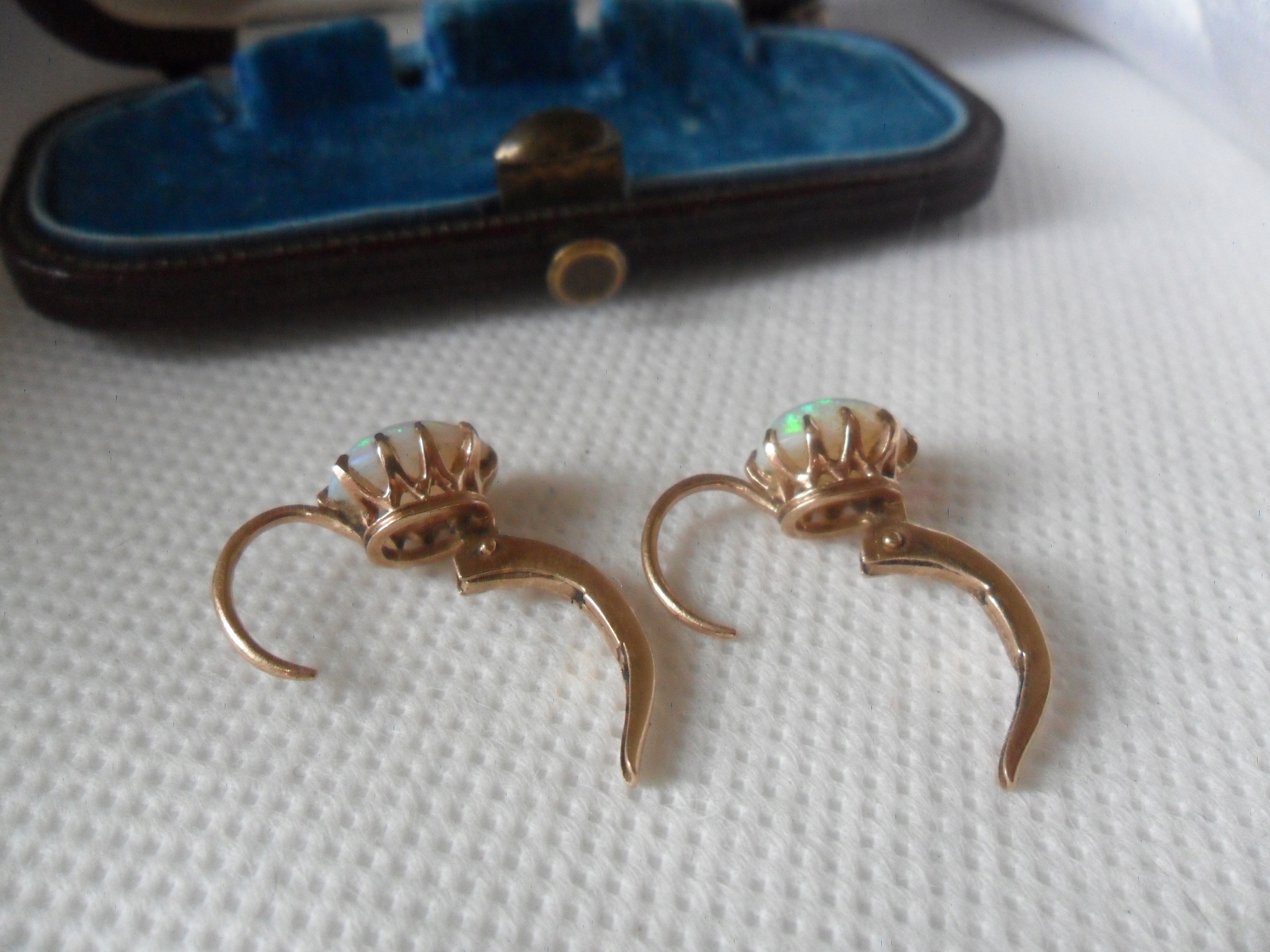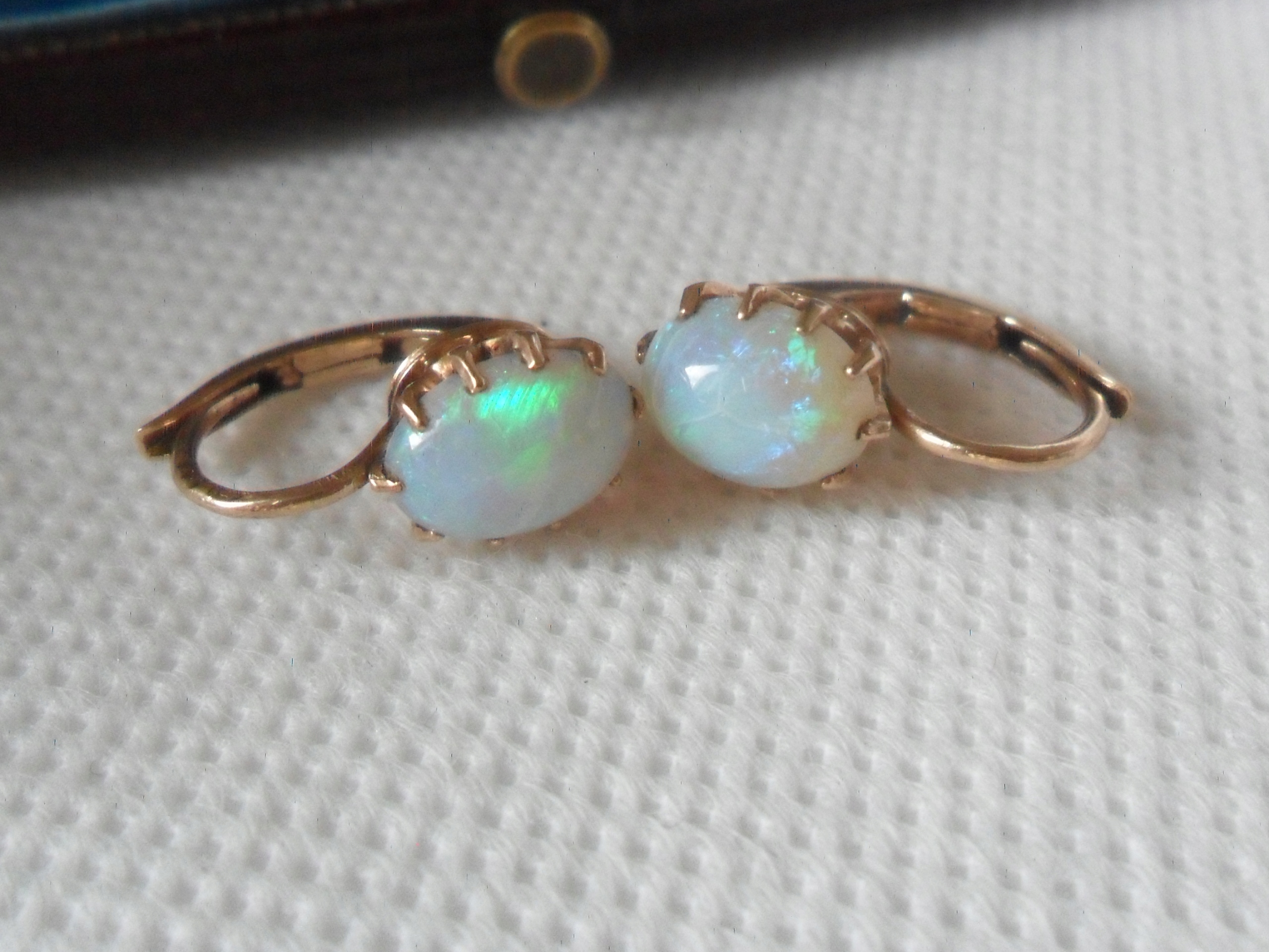 Серьги, изготовленные в ралли 580. Украшение - загар с красивой цветной игрой, зеленым и синим опалесцентом. Опатные размеры 6,6 х 8,4 мм высота ок. Размеры серьгов - общая длина 1,5 см, ширина макс. 7 мм. Серьги вес 2,800 грамм. Подписанная попытка золота. В Австро - Wegrzech во втором лаке 19 -го века с городской чертой Вены и второй подписью частично неразборчивой. Условие, как на фотографиях. Аукцион сами относится к серьге