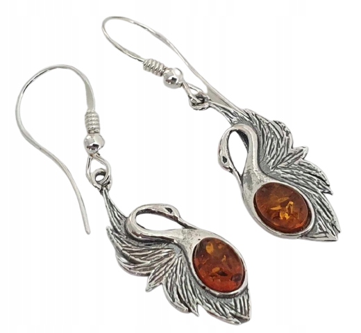 СЕРЬГИ-ВИСЯЧИ ЛЕБЕДЬ ИЗ СЕРЕБРА 925 ПРОБЫ С НАТУРАЛЬНЫМ ЯНТАРЕМ
