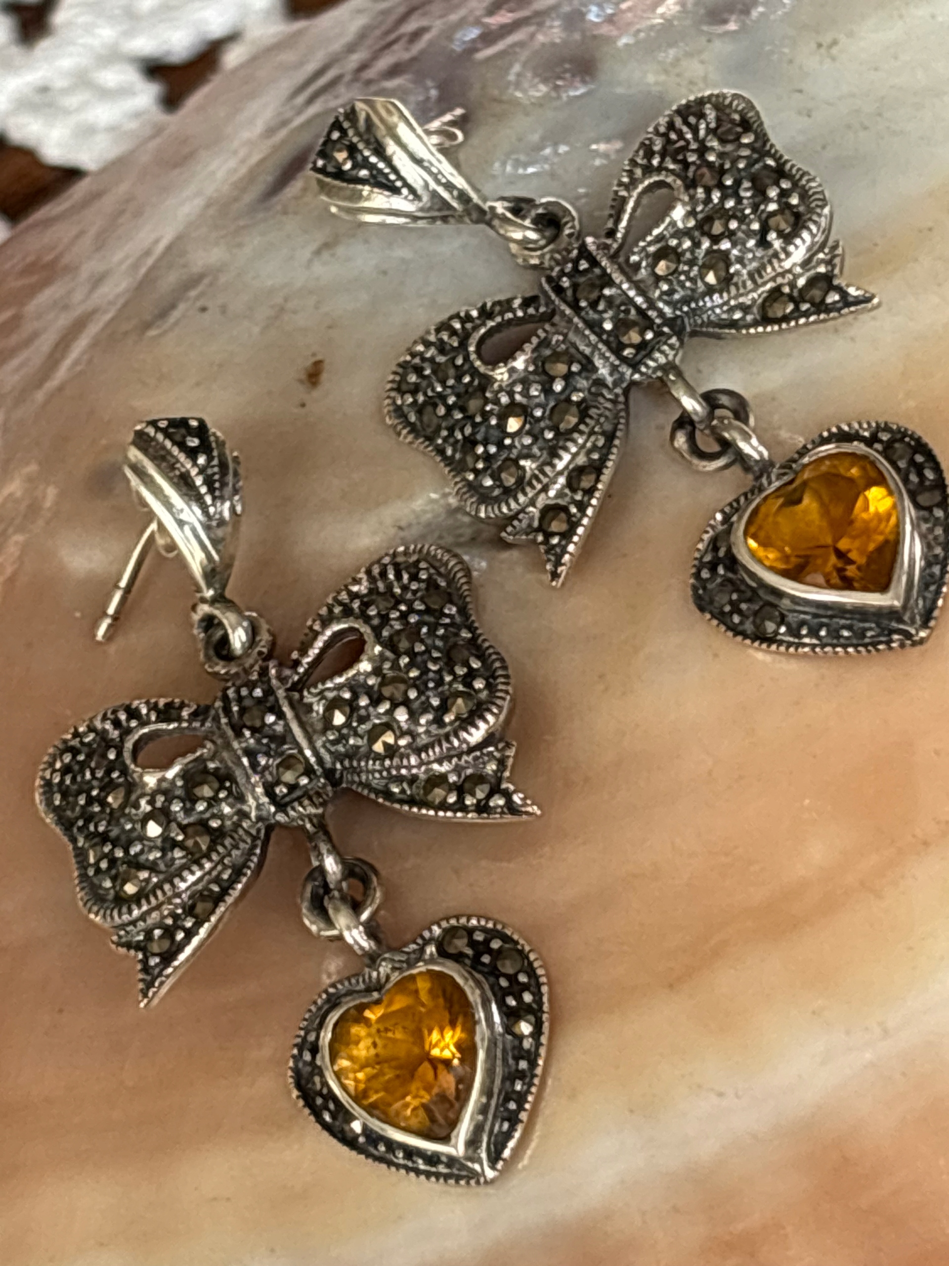 Серьги старые серебряные висящие луки апельсиновый камень марказиты
