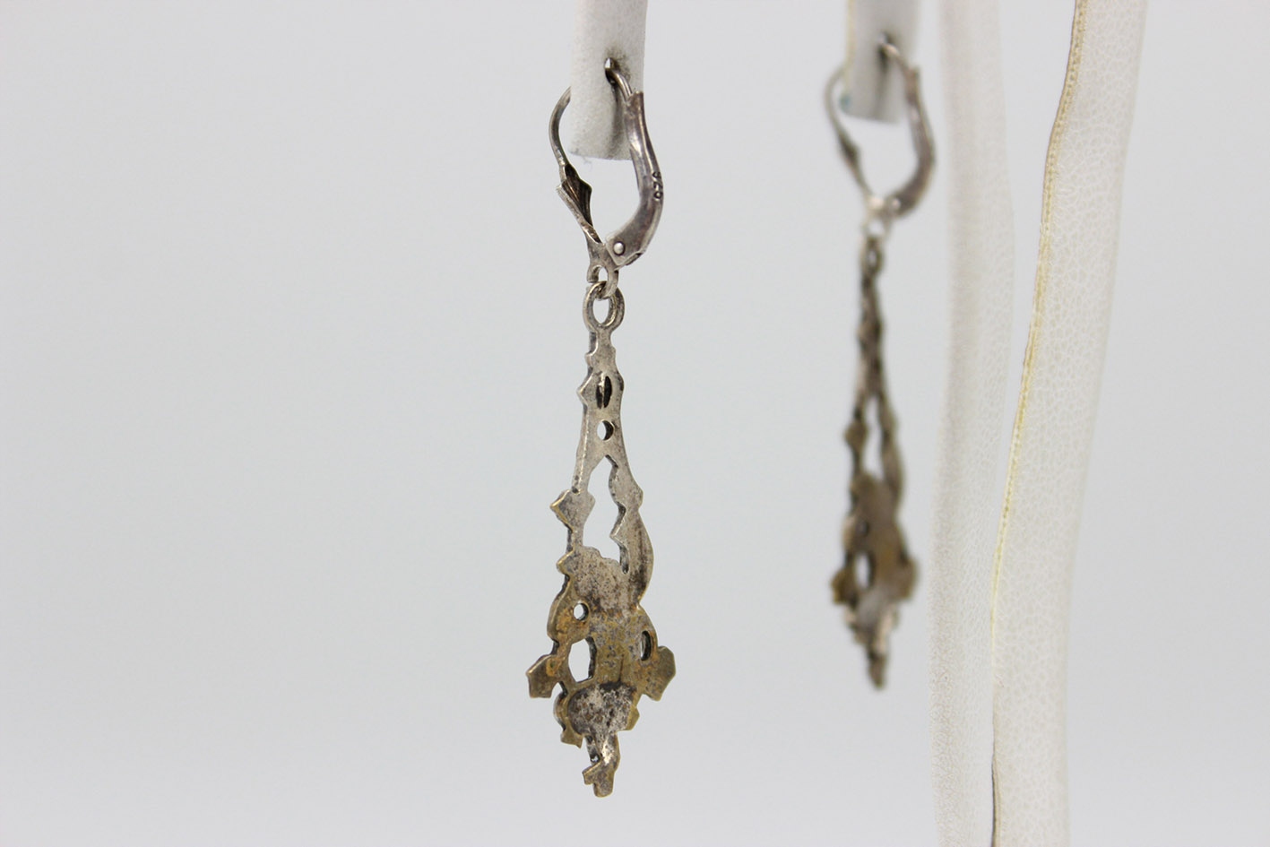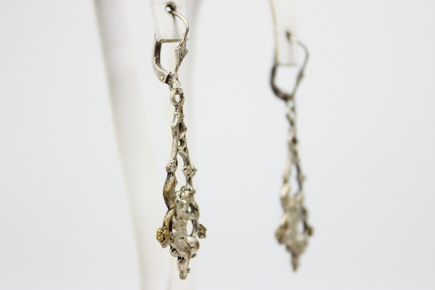 Чрезвычайно очаровательные серьги с открытыми работами с первого десятилетия 20 -го века. Продукт изготовлен из смешанных материалов. Bigles in Silver, декоративная часть, изображающая херувим на качелях, сделанном в серебряной латуни. Все в очень хорошем состоянии, только нежные ссадины, видимые на декоративных элементах. Закрепители пружин. страна.