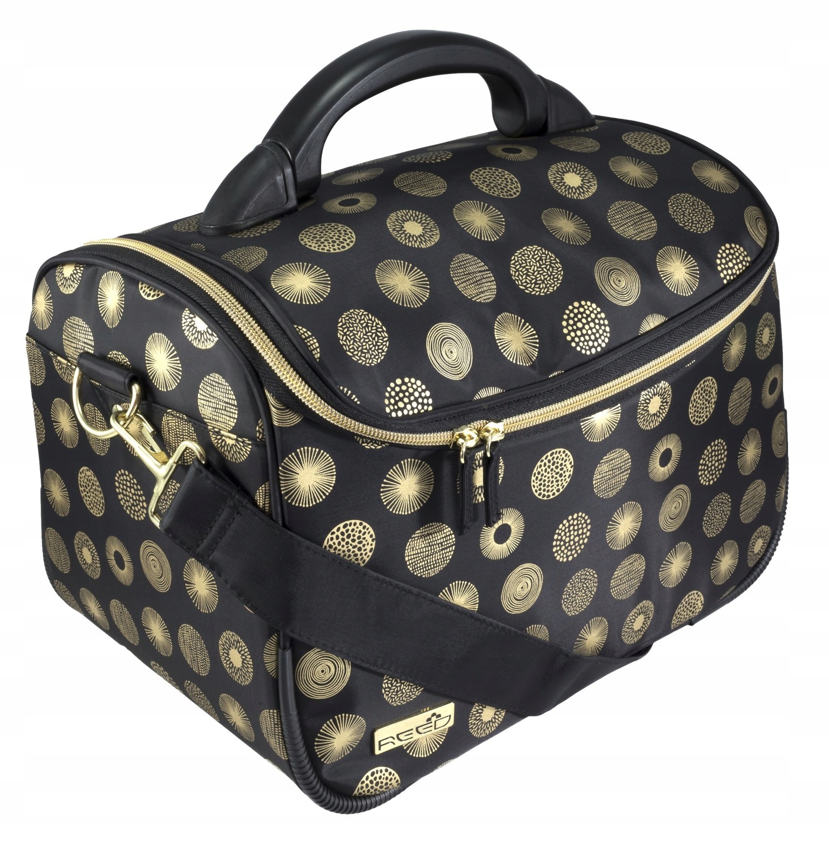 Красивая, элегантная косметичка с двумя отделениями из водонепроницаемого черного материала с золотыми кружками. Внутренняя часть выполнена в красивом золотистом цвете, чтобы сохранить и подчеркнуть уникальность этой серии косметичек. Закрывается на молнию, также золотого цвета. Внутри первое большее отделение оснащено сетчатым карманом, меньшее отделение спереди также имеет сетчатый карман и резинку для удержания вещей в вертикальном положении. Элегантный металлический логотип REED спереди.