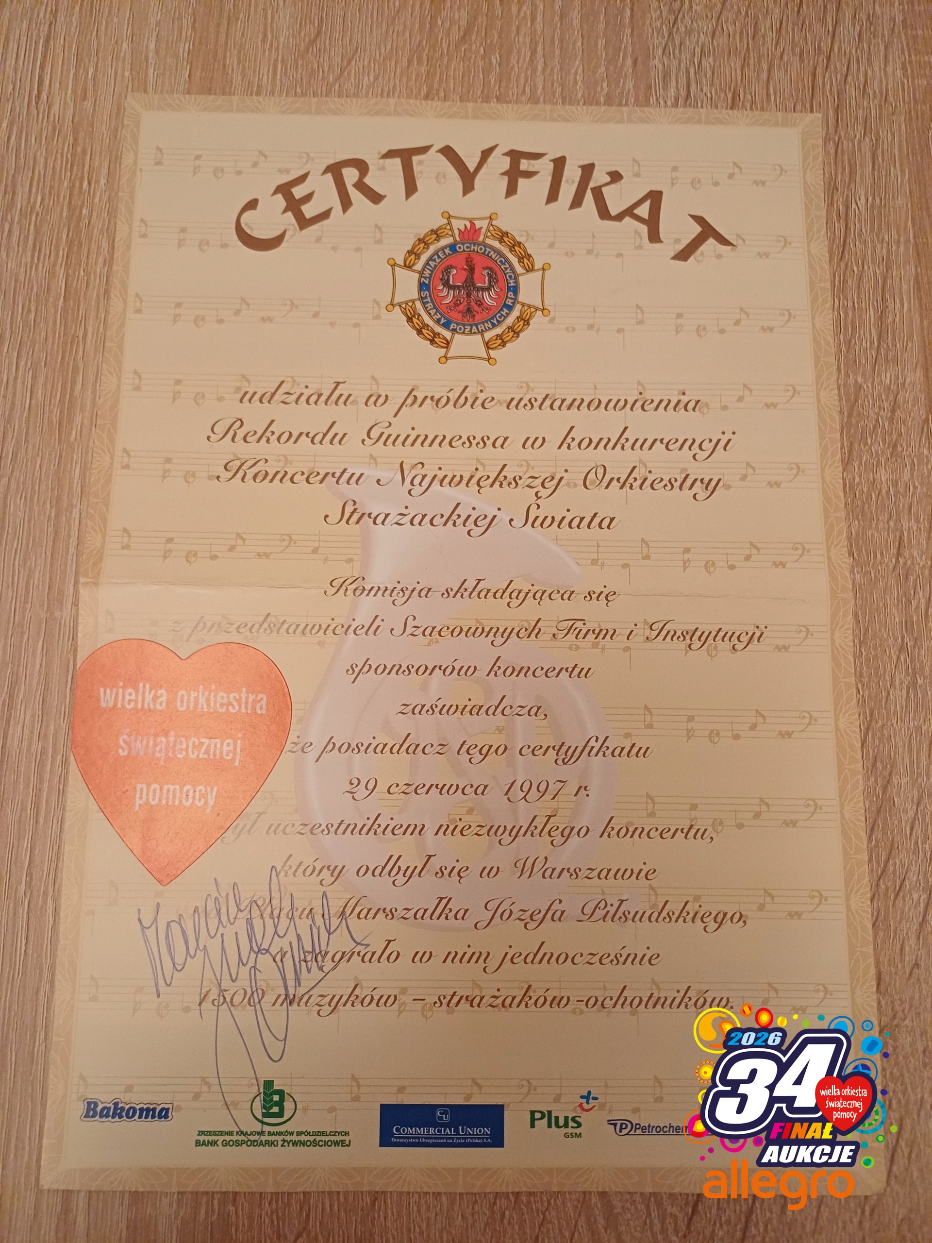 Сертификат об участии в попытке установить рекорд Гиннеса в конкурсе «Концерт крупнейшего в мире оркестра пожарных» с автографом Юрека Овсиака (с посвящением Марцину). 29 июня 1997 года обладатель сертификата принял участие в необычном концерте, который состоялся в Варшаве на площади Маршала Юзефа Пилсудского и на котором присутствовало 1500 музыкантов - пожарных-добровольцев.