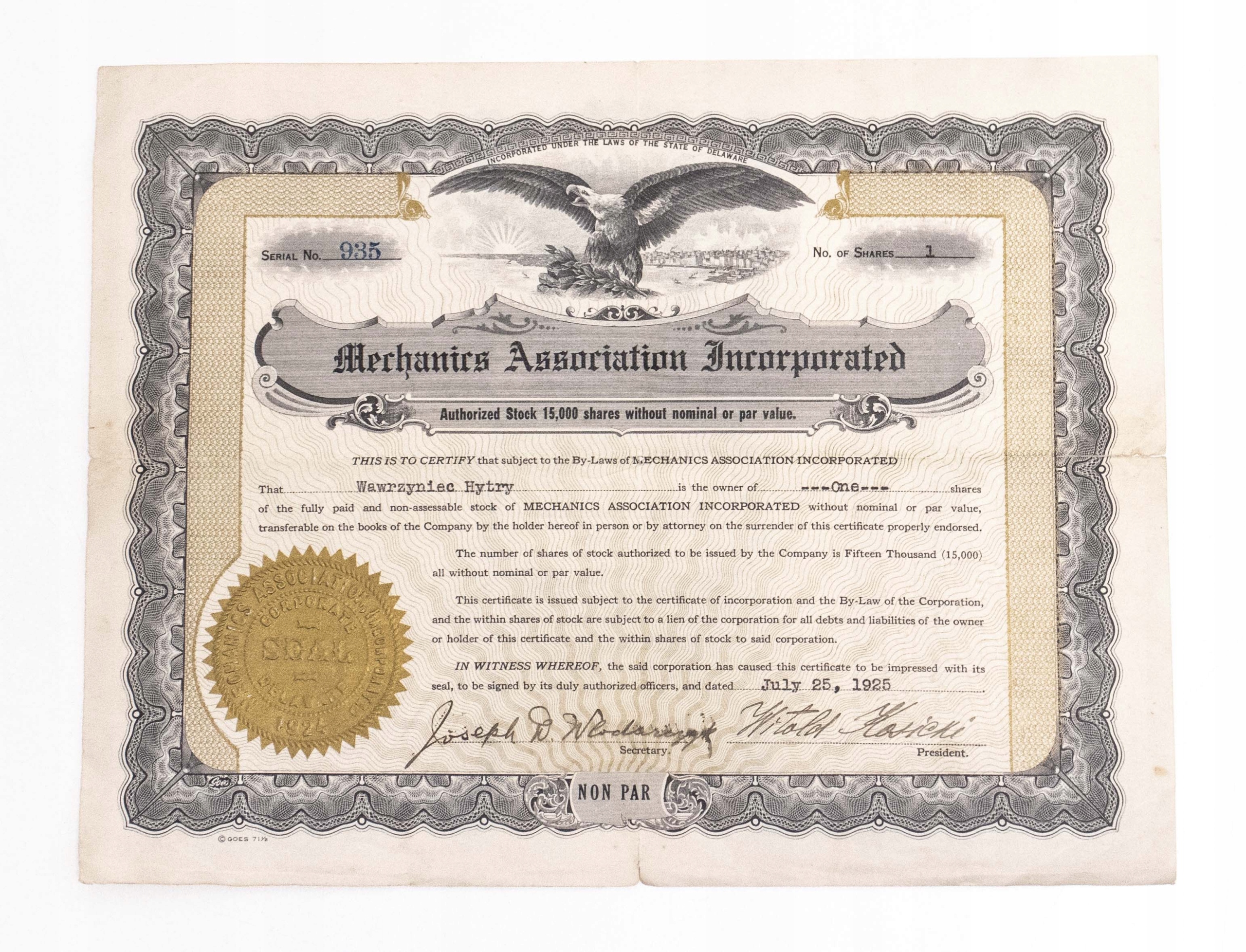 Сертификат Mechanics Association Incorporated, Сил Делавэр, 1924/1925 г.