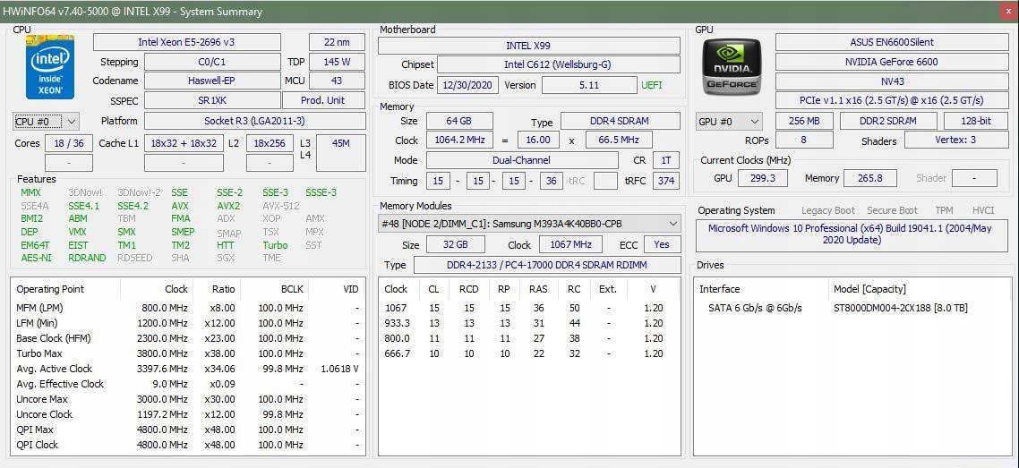 - ОЗУ: 2× 32 ГБ PC4-17000 DDR4 RDIMM Samsung (всего 64 ГБ ECC)
