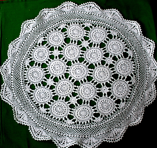 Салфетка-скатерть с розочками, крючком, лоскутный узор, диаметр 44 см.
