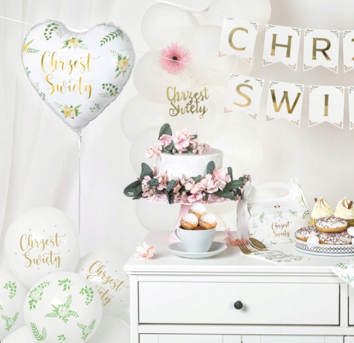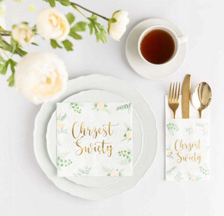Красивые нежные салфетки на Святое Крещение вашего ребенка. Белая салфетка с изящной, блестящей золотой надписью «Святое Крещение», дополненной цветочным принтом, сложенная так, что в нее легко можно положить столовые приборы, и уникальное украшение готово.