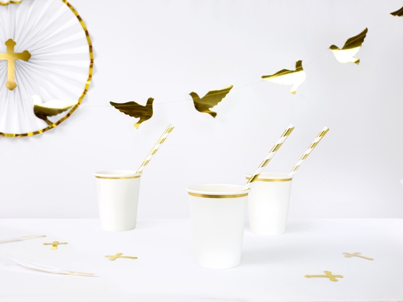 - 10 белых шаров пастельных тонов с двухсторонним золотым принтом причастия.
