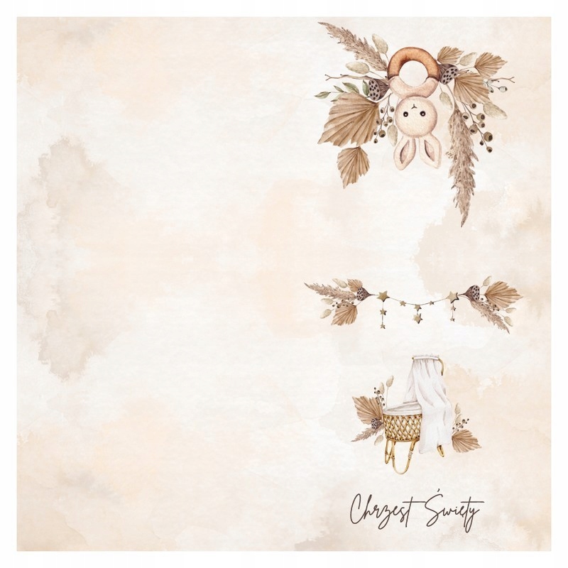 Крестильные салфетки с колыбелькой в стиле бохо – одни из самых модных для крестин ребенка. Салфетки имеют разный принт на каждой стороне – на одной стороне отпечаток колыбели и надпись «Святое Крещение», на другой – мотив прорезывателя и кустиков. Остальные две страницы гладкие, с акварельным рисунком - красивый эффект.