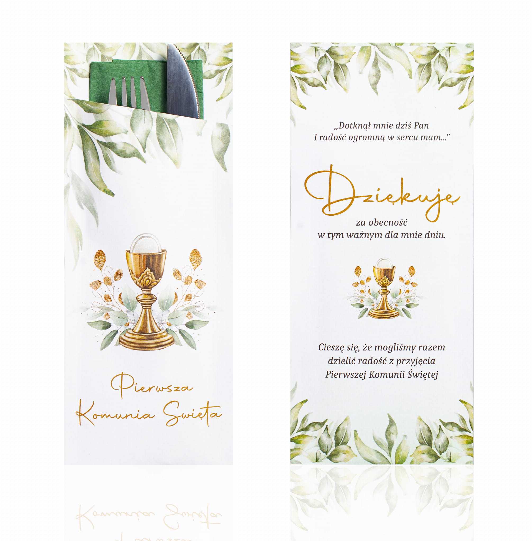 Карманы для столовых приборов позволяют легко создать элегантную сервировку стола. Графика на карманах идеально подойдет в качестве украшения стола к Первому Причастию как девочкам, так и мальчикам.