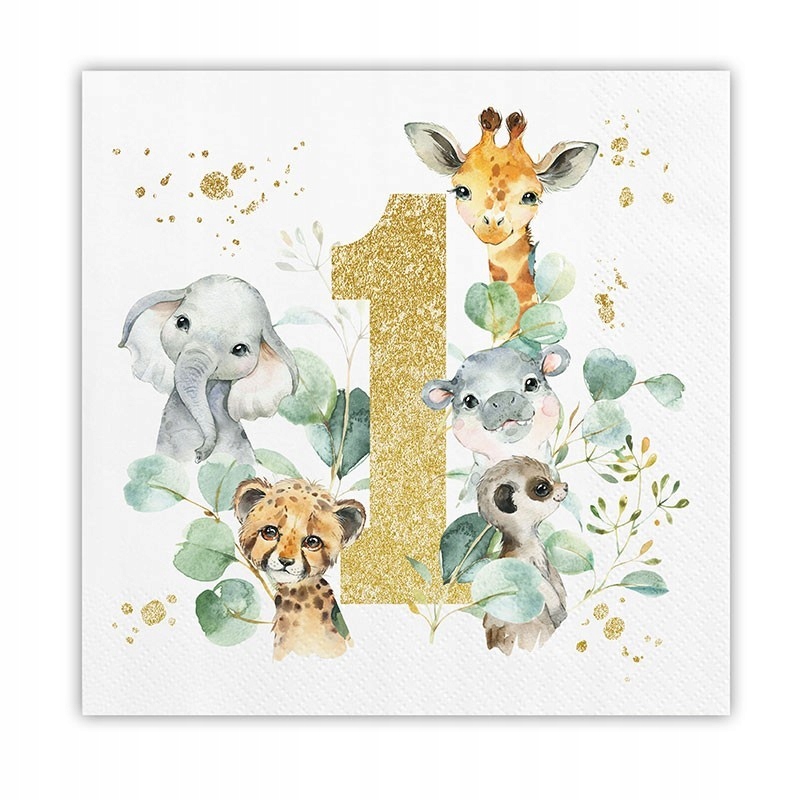 <ул> <ли> состав: 20 штук белых бумажных салфеток на день рождения ребенка с мотивом сафари и золотой цифрой <ли> материал: 3-слойная бумагаРазмер: