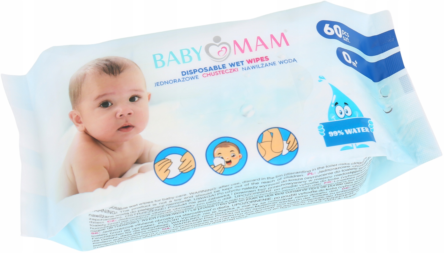 СЕРВЕТКИ ЗВОЛОЖЕНІ ВОДОЮ ДИТЯЧІ ВОЛОГІ 99% PURE WATER BABYMAM 60шт
