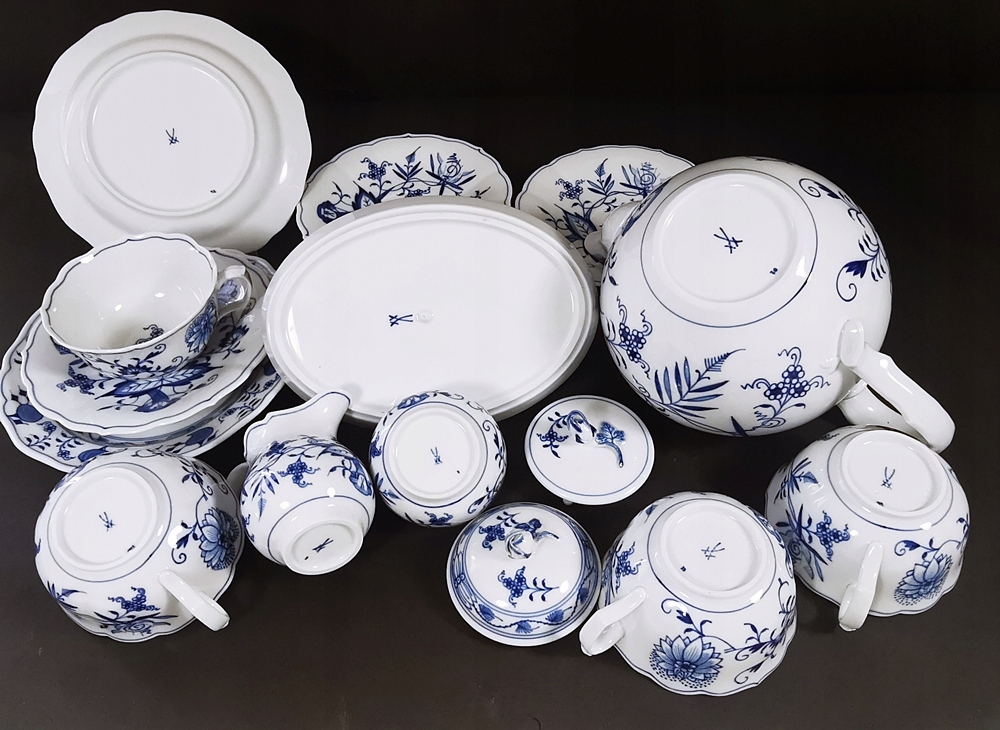 Сервиз пронумерован и подписан подглазурной мейсенскими мечами без надрезов и знаком мейсенского меча с четырьмя надрезами (фарфор, предназначенный для личного пользования Мейсенская Мануфактура (Мейсен).