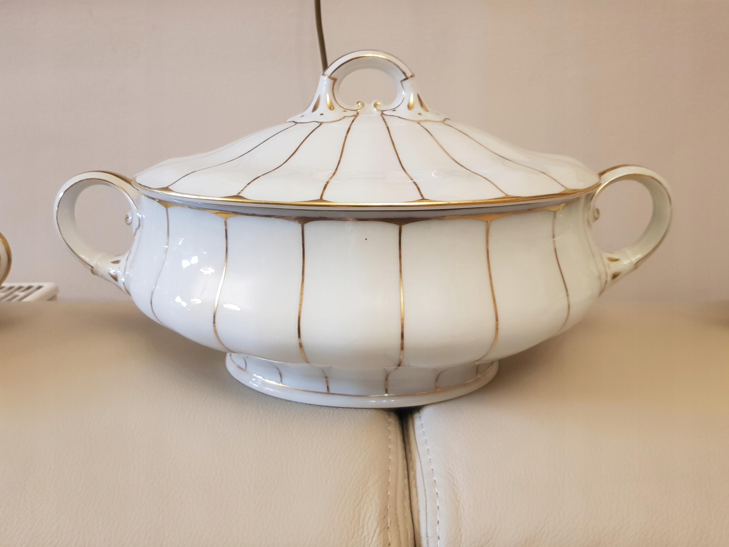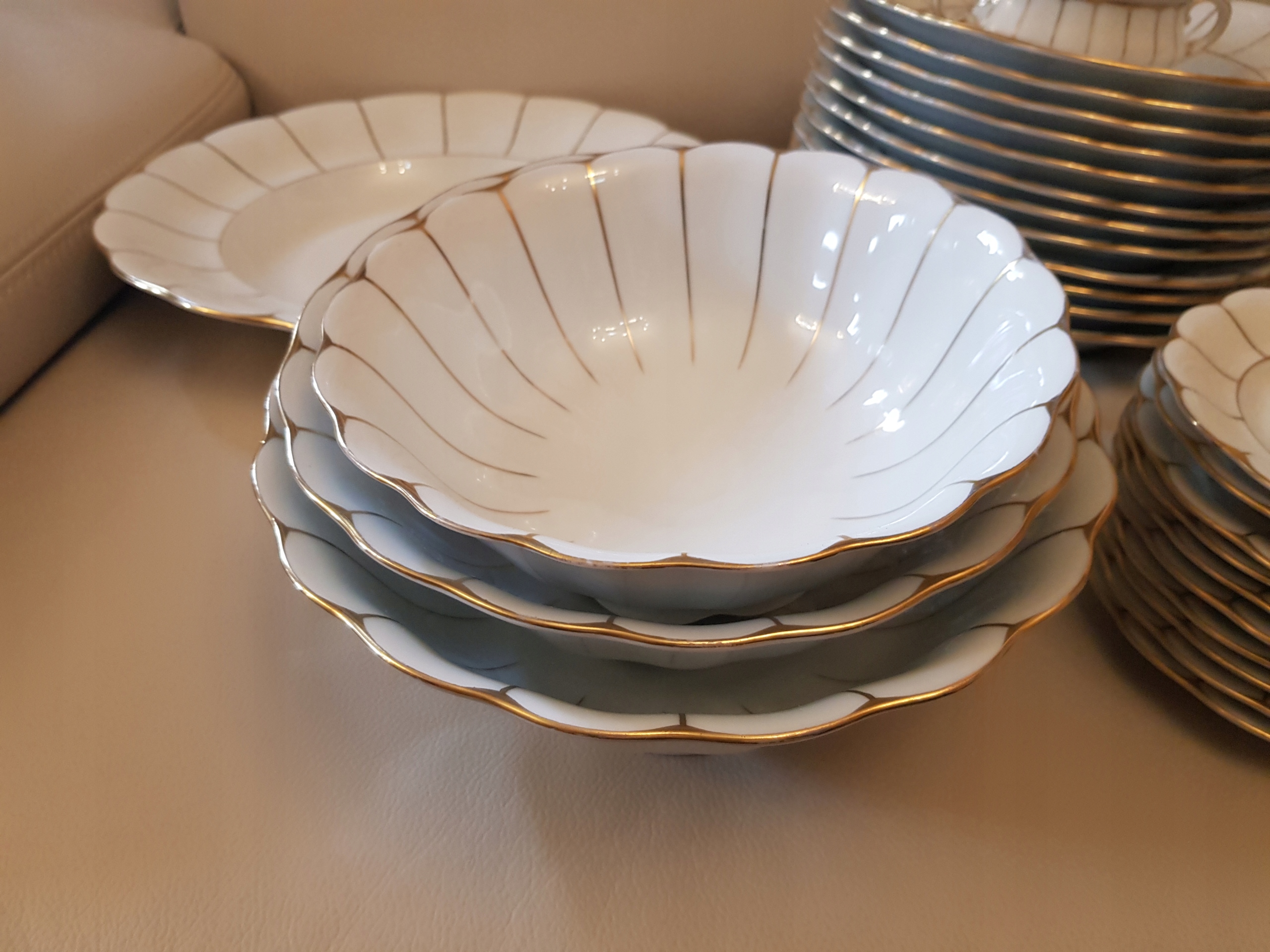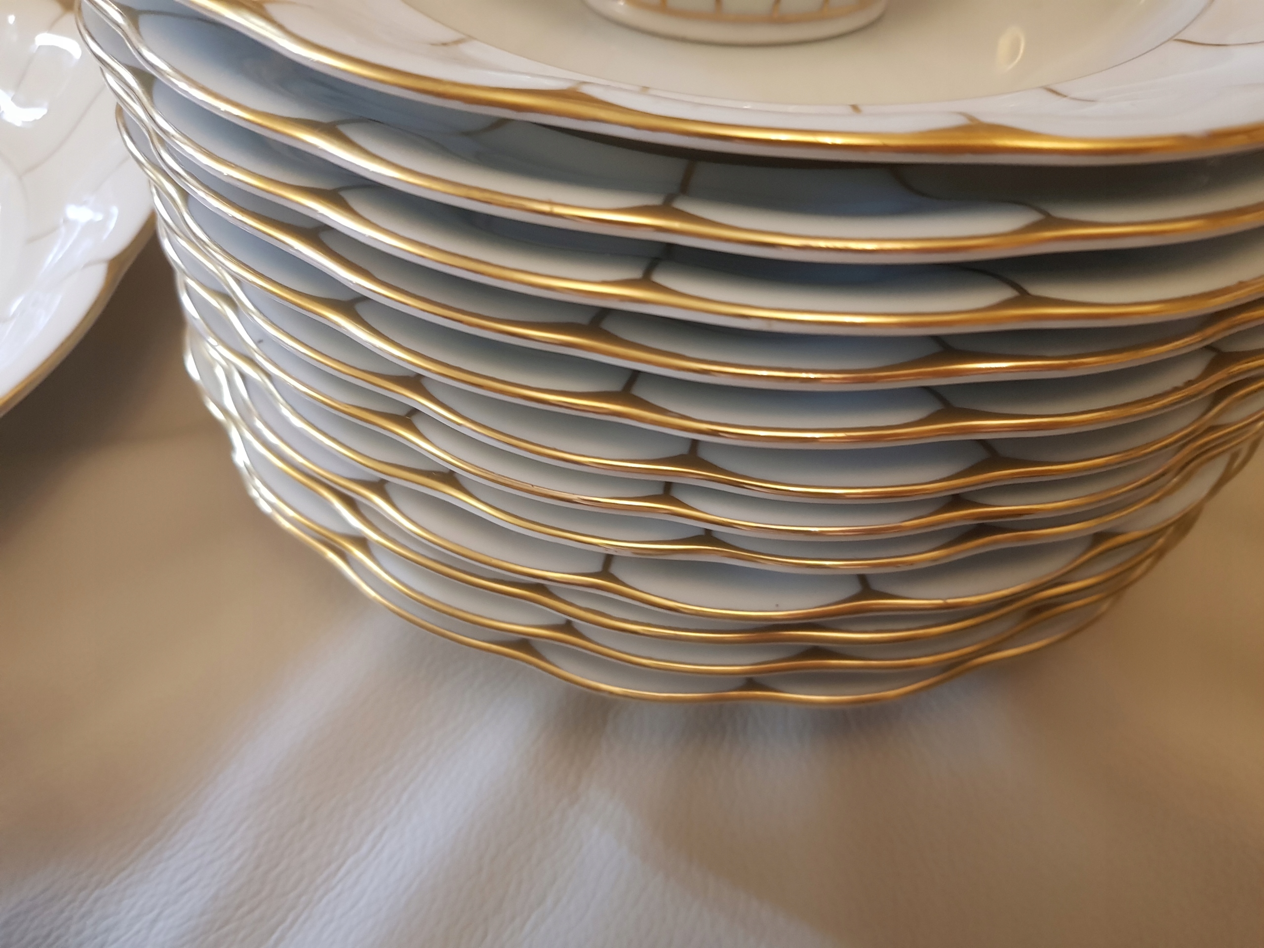 Предмет аукциона - обеденный сервиз работы Кенигсельт-Явожины Слёнской, модель Розелла.Белый фарфор, украшенный золотыми полосками.В комплект входят: 3 вазы, 12 суповых тарелок, 12 обеденных тарелок, 12 десертных тарелок. , 10 тарелок для закусок, 2 блюдца, 2 большие тарелки, 2 тарелки, 3 салатницы, 2 контейнера для специй, 1 корзина.