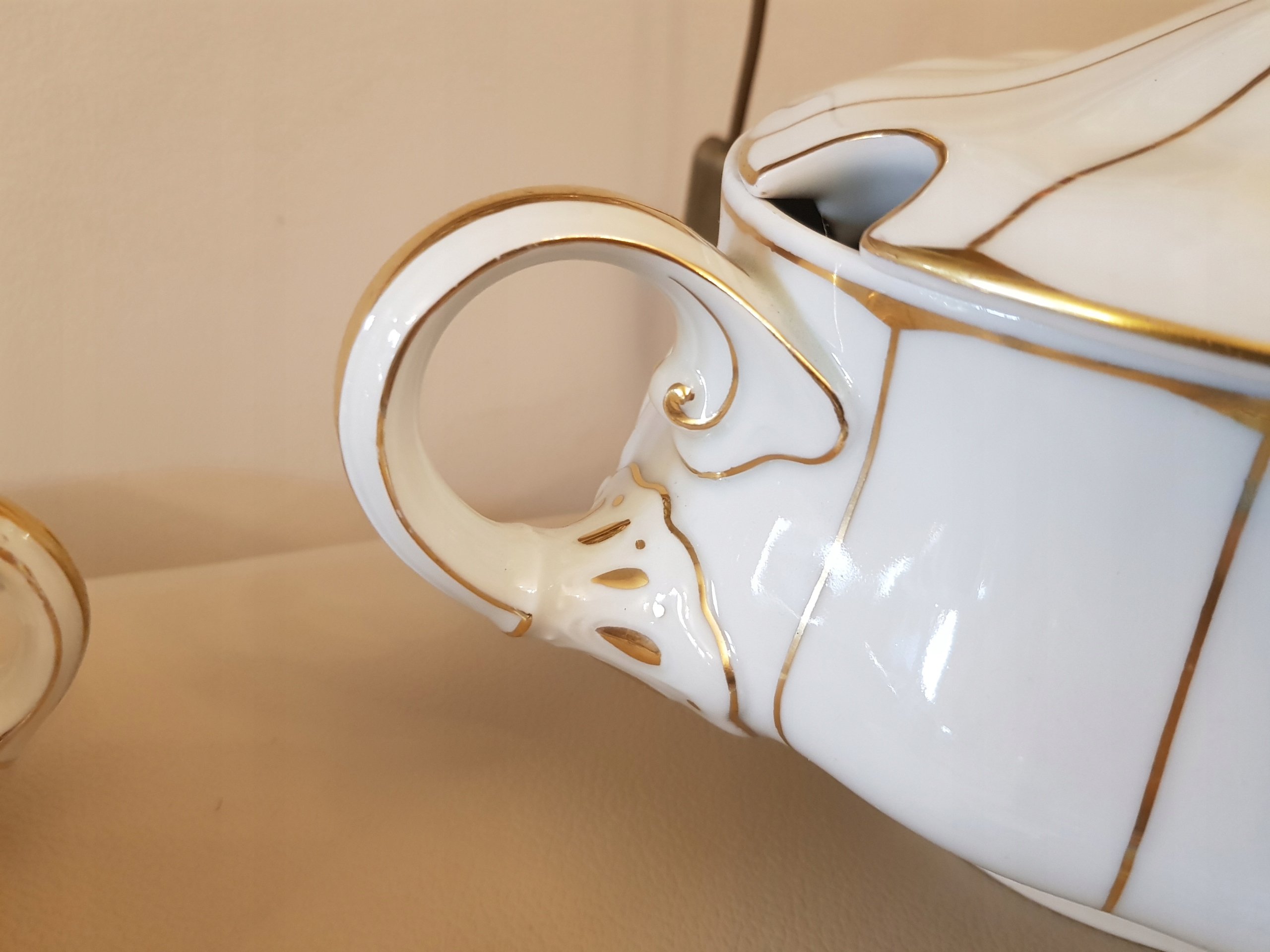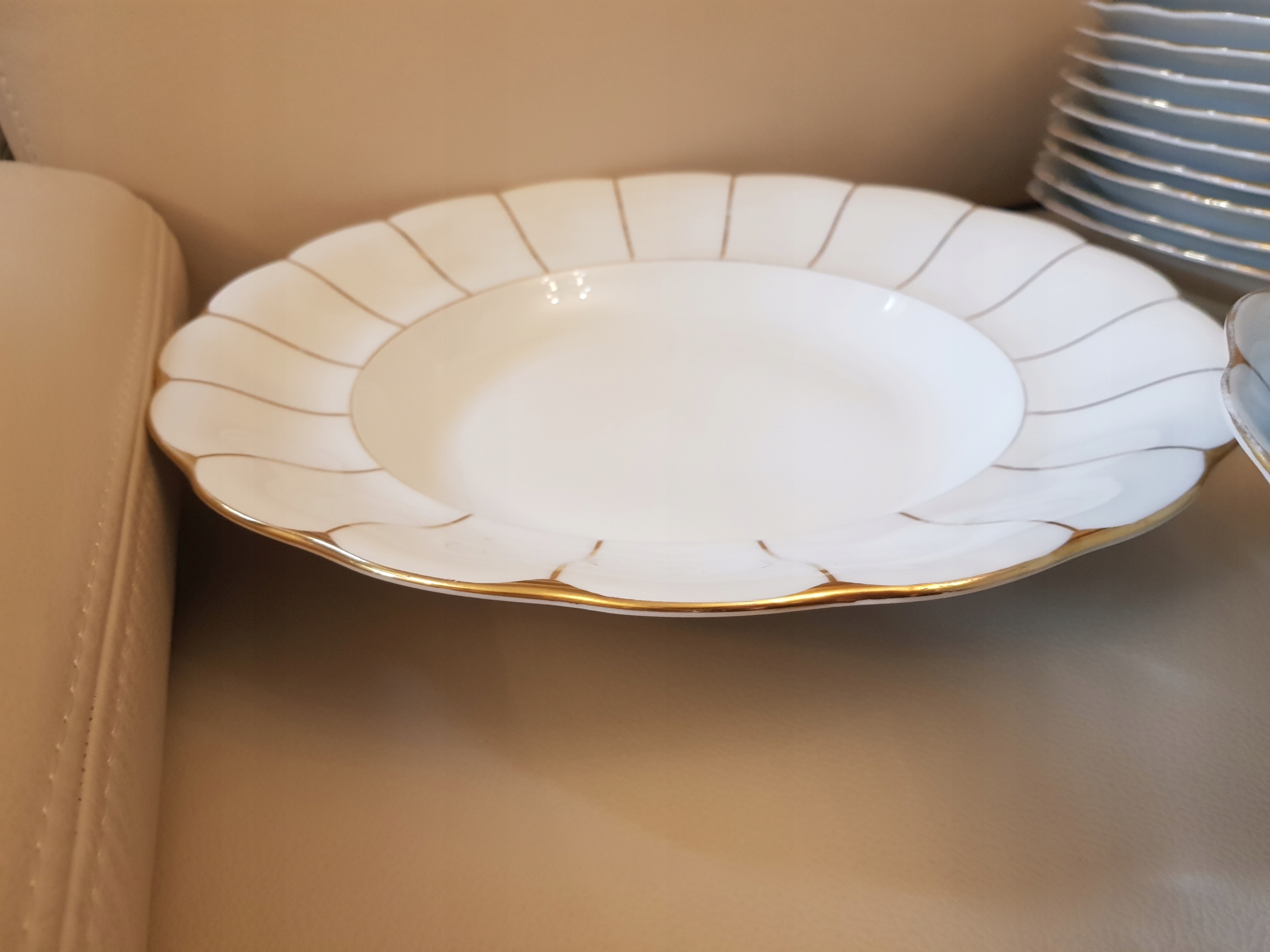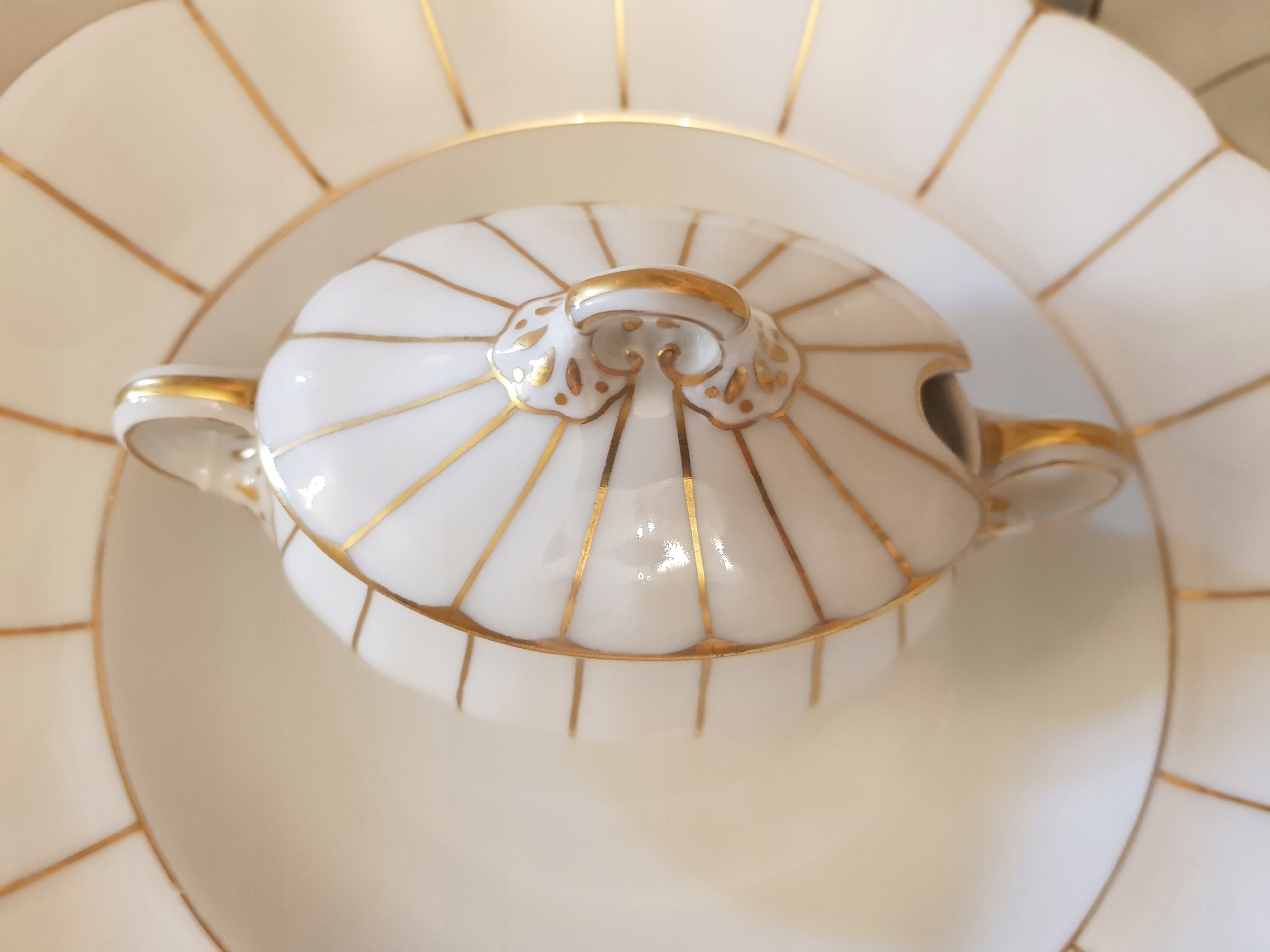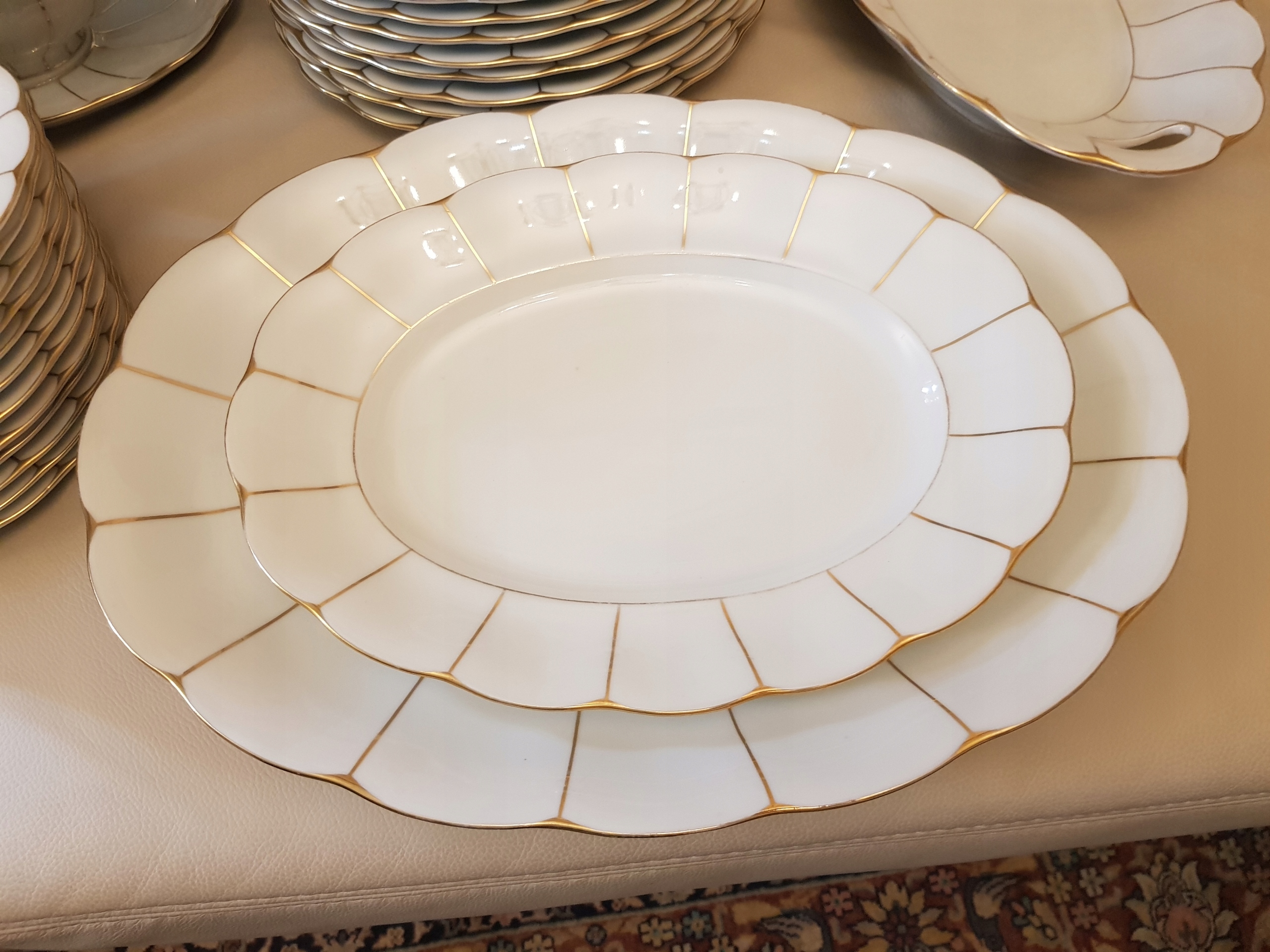 Предмет аукциона - обеденный сервиз работы Кенигсельт-Явожины Слёнской, модель Розелла.Белый фарфор, украшенный золотыми полосками.В комплект входят: 3 вазы, 12 суповых тарелок, 12 обеденных тарелок, 12 десертных тарелок. , 10 тарелок для закусок, 2 блюдца, 2 большие тарелки, 2 тарелки, 3 салатницы, 2 контейнера для специй, 1 корзина.