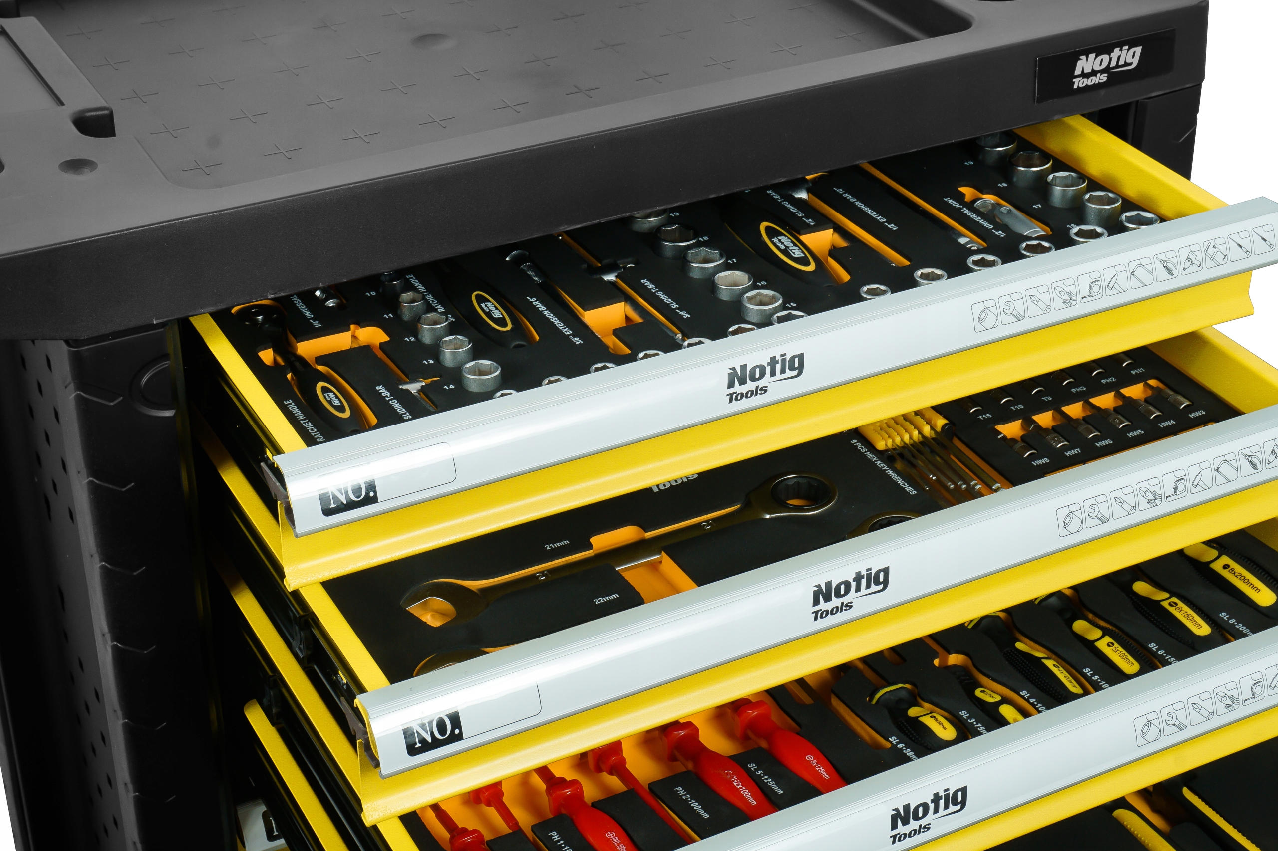 Шкаф для инструментов Notig Tools имеет7 практичных ящиков для инструментов, закрывающихся на центральный замок. Все ящики полностью открываются и имеют металлические шариковые направляющие, что обеспечивает длительную, плавную и надежную работу. Ящики фиксируются замком с храповым механизмом, который обеспечивает защиту окружающей среды во время транспортировки. Поверхность столешницы устойчива к маслам и жирам. Пятидюймовые, бесшумные, поворотные колеса облегчают маневрирование шкафа, а также оснащены тормозом. Шкаф оснащен ручкой, облегчающей его переноску. Это позволяет поддерживать порядок на рабочем месте. Благодаря ящикам, закрывающимся на ключ, инструменты защищаются от кражи.