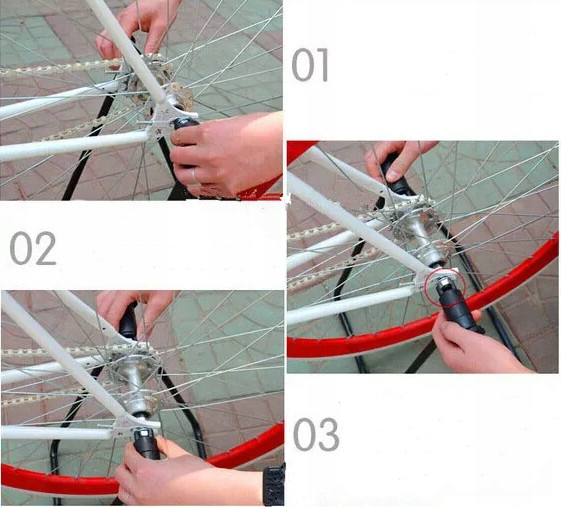 1. Поместите раму под гайку заднего колеса велосипеда, отрегулируйте ширину в соответствии с задней осью.