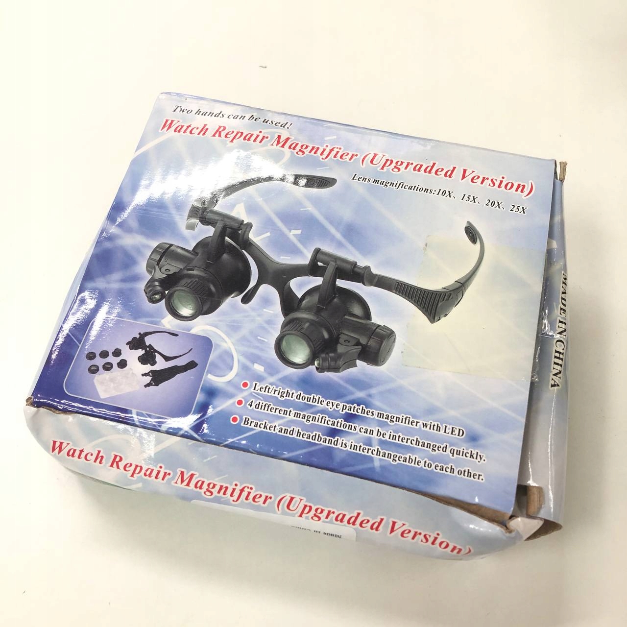 Лупа увеличительная с возможностью работы на левый или правый глаз, имеет сменные крепления: традиционное крепление за ушами (как у традиционных очков) или крепление на голове с помощью гибкого оголовья, что обеспечивает комфортную работу. Мягкие насадки (ухо и нос). Увеличительные линзы можно регулировать вверх и вниз, поднимать на 180 футов.