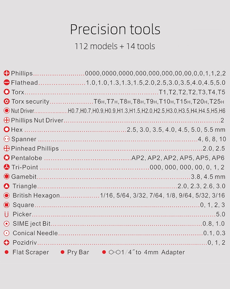 - 14 крестообразных/крестовых головок «папа» (+): PH0000 , PH0000, PH0000, PH000, PH000, PH000, PH00, PH00, PH0, PH0, PH1, PH1, PH2, PH2