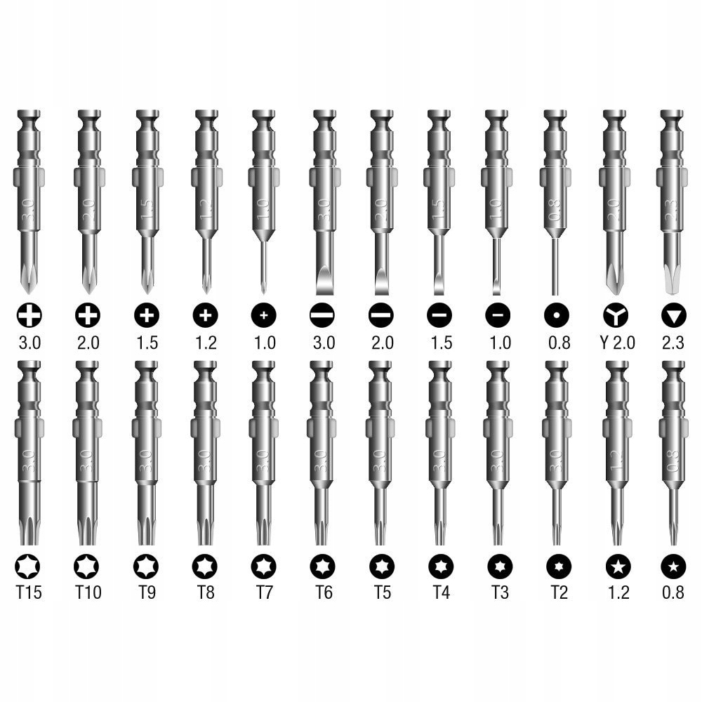- Torx: T2, T3, T4, T5, T6, T7, T8, T9, T10, T15