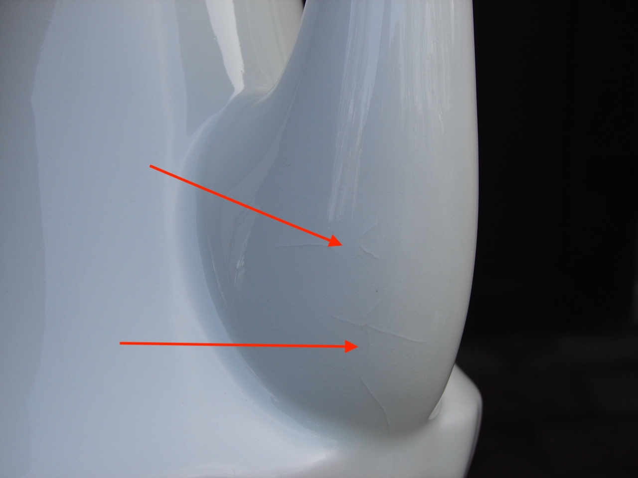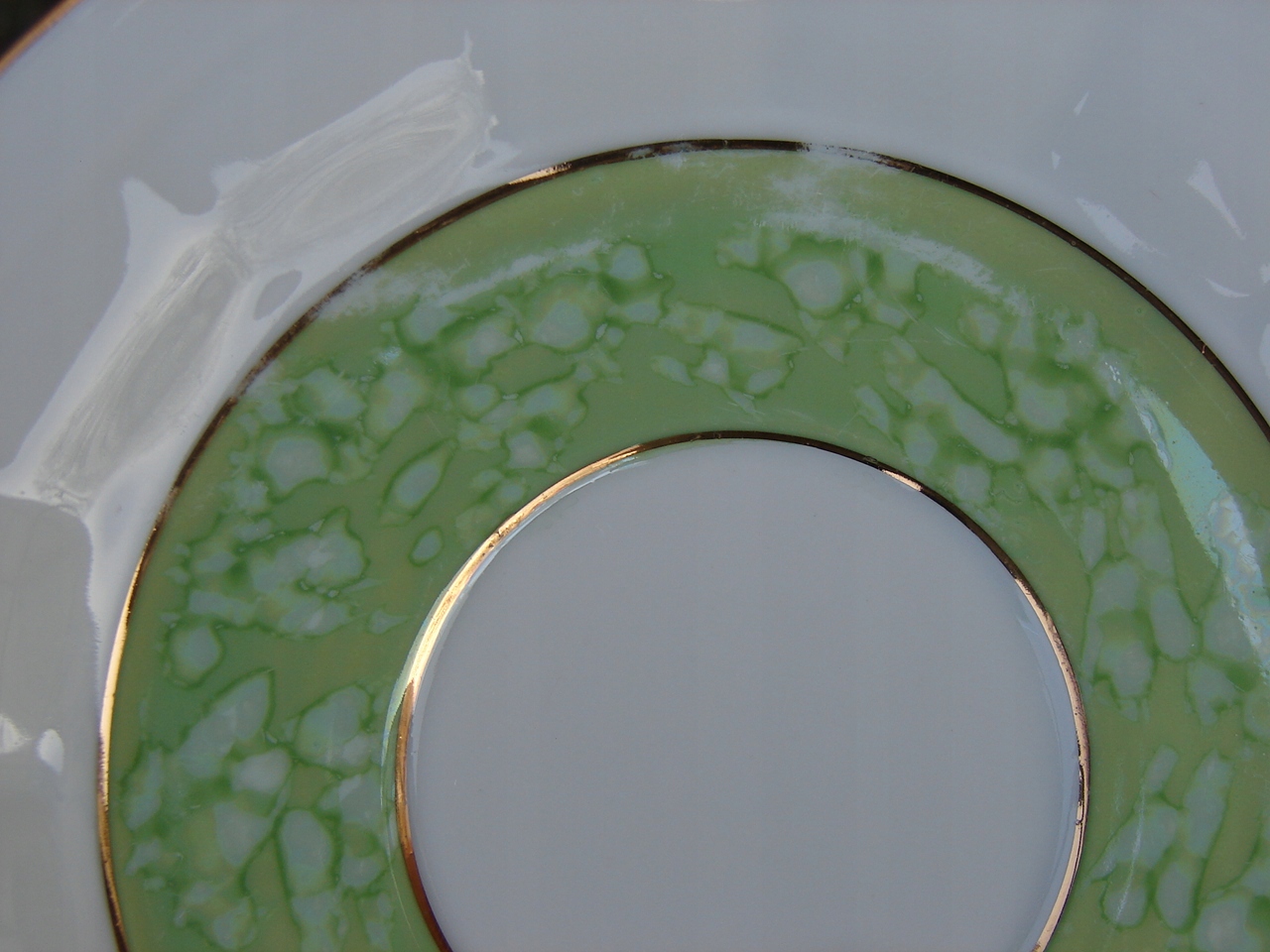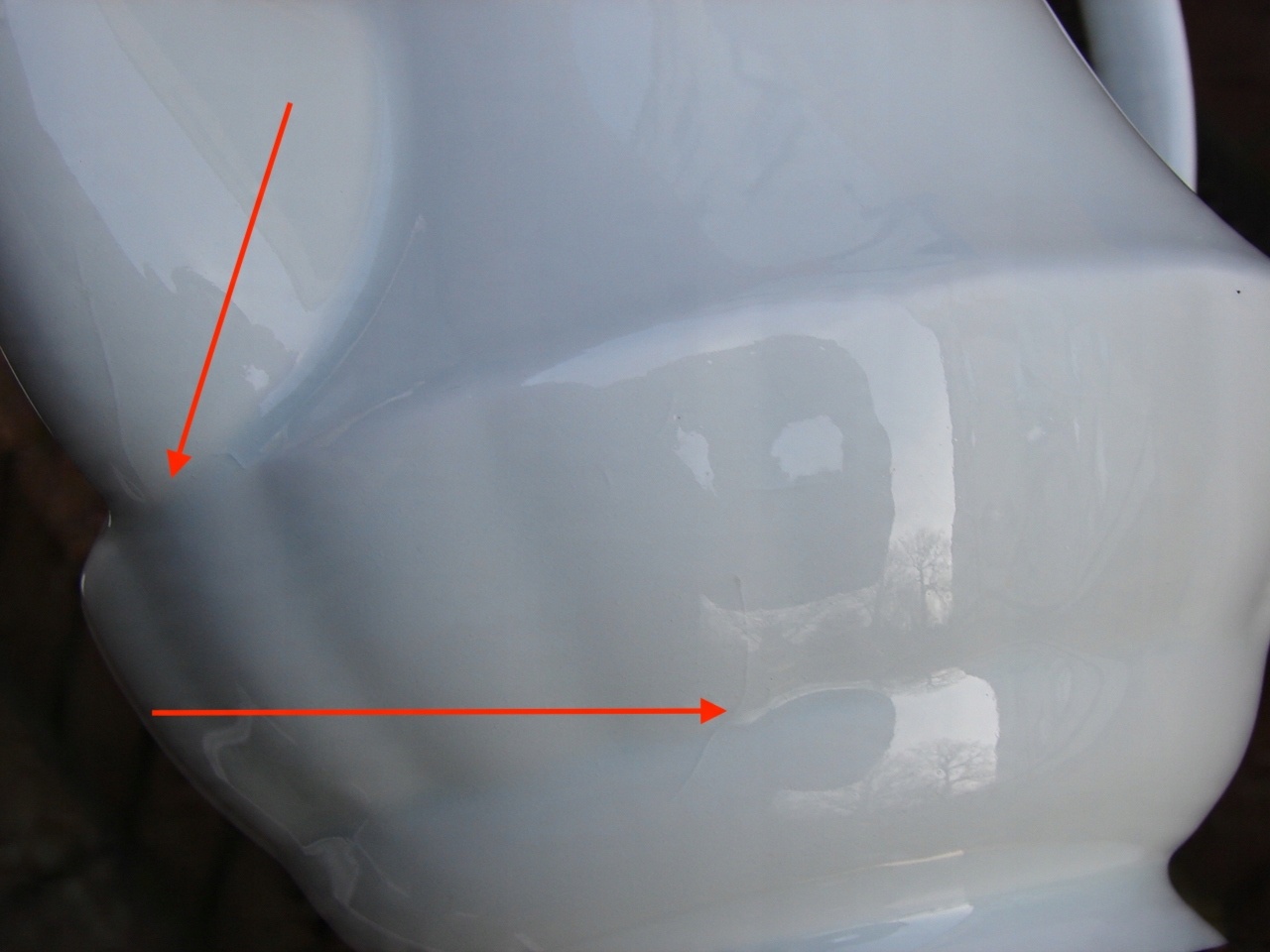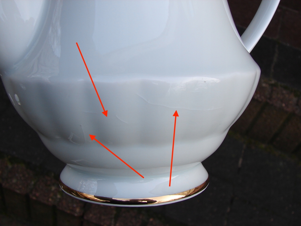 Весь предмет в хорошей сохранности, имеет следы эксплуатации в виде локальных царапин и потертостей. к шаблону. На лаке чайника имеются микротрещины в местах, не являющихся двусторонними трещинами. Фарфор клейкий и точно не развалится. Места трещин показаны красными стрелками при увеличении.