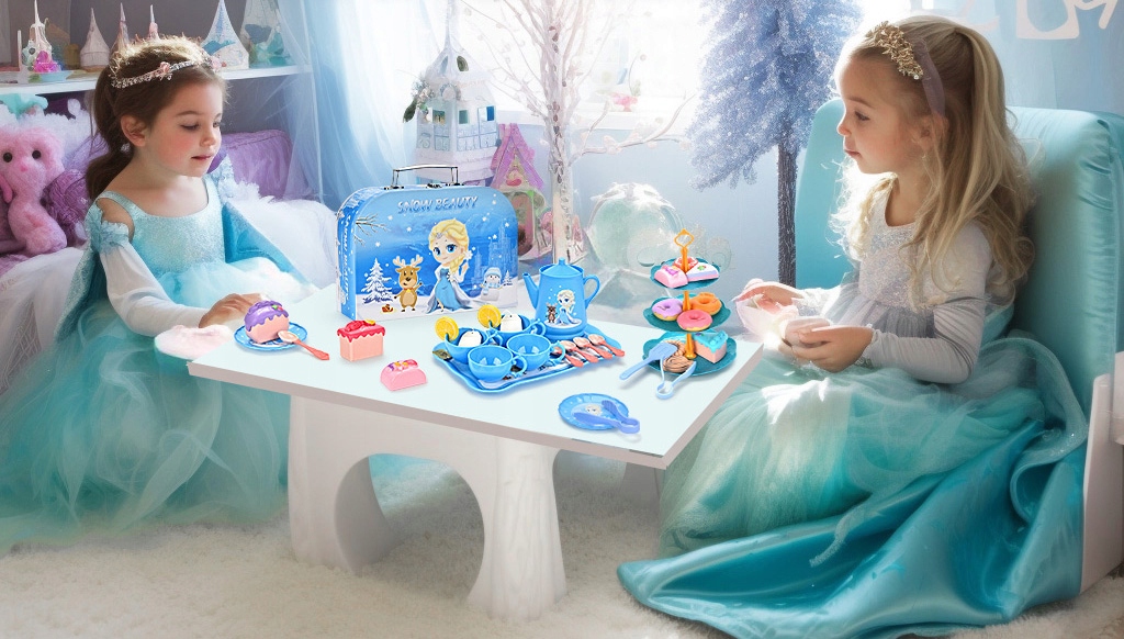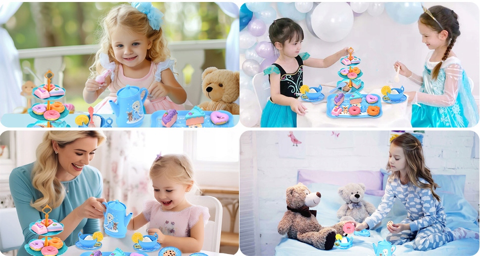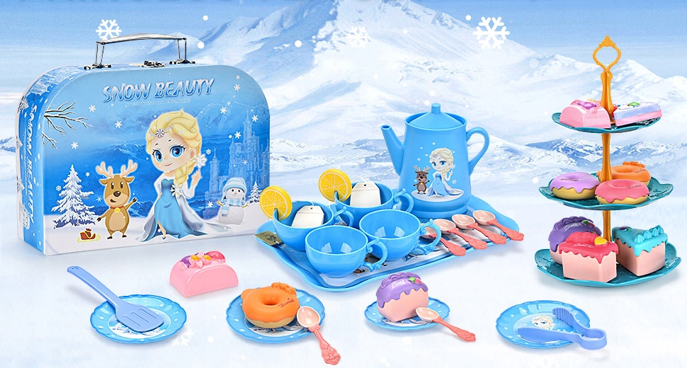 - 1 teapot, 4 cups, 4 plates, 4 tbsp, 1 large plate, 1 Подача подноса, 19 пластиковых десертов ABS для игры и чехла с мотивом Ice Land