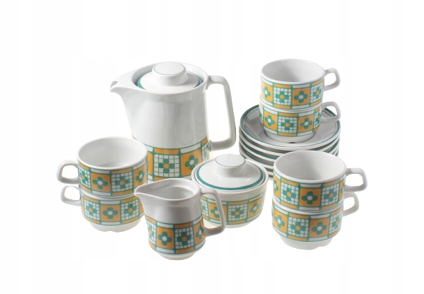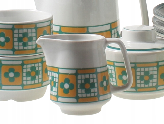 Фарфоровый сервиз КОФЕЙНО-ЧАЙНЫЙ на шесть персон. В комплект входят: кувшин, сахарница, молочник, 6 чашек и 6 блюдец. Сервиз произведен на заводе столового фарфора «Лубяна» в Лубяне. 1970-е годы
