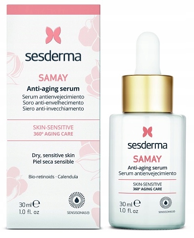 Сыворотка SESDERMA SAMAY создана с учетом потребностей стареющей и чувствительной кожи. Легкая и жидкая консистенция делает сыворотку идеальной в качестве основы для ухода и улучшает проникновение активных ингредиентов в кожу. Биоретиноиды действуют аналогично ретиноидам, обеспечивая антивозрастной эффект, но с высокой степенью переносимости для чувствительной кожи. Календула оказывает доказанный успокаивающий эффект на раздраженную кожу. Bioecolia® защищает естественную сапрофитную флору кожи. Аллантоин – производное мочевины с двойным эффектом: увлажнением и регенерацией кожи. Для повышения эффективности активных веществ они заключены в SENSISOMAS®: инновационные липосомы нанометрового размера, разработанные Sesderma специально для чувствительной и реактивной кожи. Они обеспечивают липиды, аналогичные тем, которые присутствуют в здоровой коже, транспортируют активные ингредиенты в самые глубокие слои кожи, укрепляя ее барьер изнутри и борясь со старением.