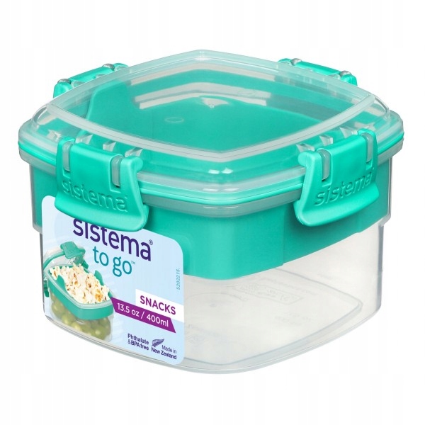 - Небольшой двухуровневый контейнер, в идеале подходит для перевозки закусок или второго завтрака для работы и школы. Он был изготовлен из твердого пластика BPA и фталатов в прозрачном цвете с зелеными аксессуарами. Он имеет прокладку на крышке и удобное, специальное закрытие с системой кликов.