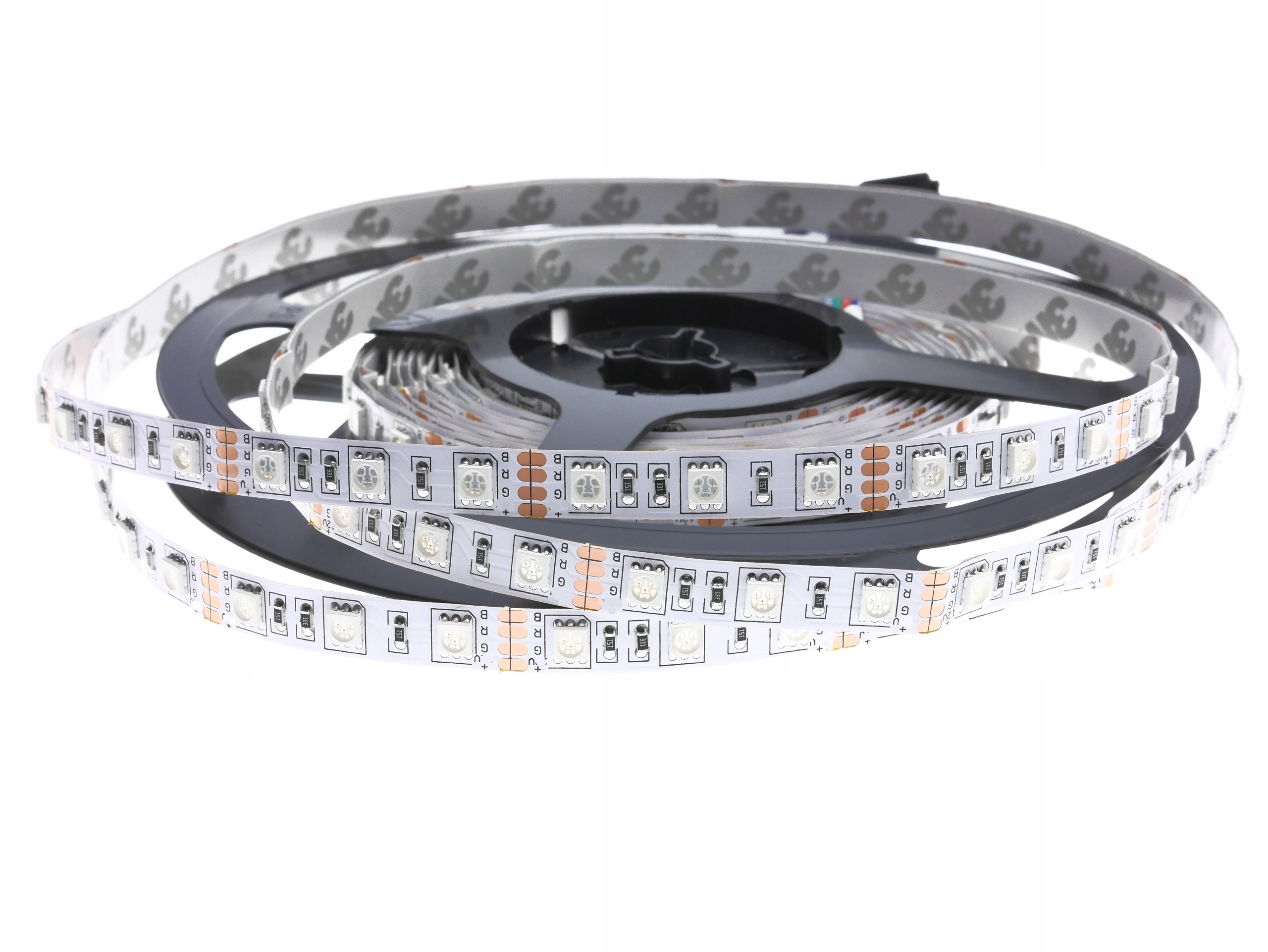Лента выпускается в рулонах по 10 метров. В каждой секции, т.е. 10 м ленты, находится 600 светодиодов SMD 5050. На 1 м ленты приходится 60 светодиодов RGB SMD 5050. Ее можно разрезать на более мелкие секции в специально отведенных местах. Припои, позволяющие разрезать ленту, располагаются через каждые 5 см. Такой модуль состоит из трех диодов и резистора, которые последовательно размещаются на гибкой белой подложке печатной платы. Благодаря использованию двойной грунтовки FPCB падения напряжения сведены к минимуму. Внутренняя часть ленты покрыта прочным двусторонним скотчем, что гарантирует очень хорошую адгезию практически к любой поверхности. Рулон имеет припаянные на заводе наконечники с обеих сторон, что позволяет легко подключить его напрямую к любому контроллеру. Необходимо в полной мере использовать возможности, которые дают RGB-диоды. Для питания светодиодной ленты потребуется настольный или монтажный блок питания напряжением 24В.