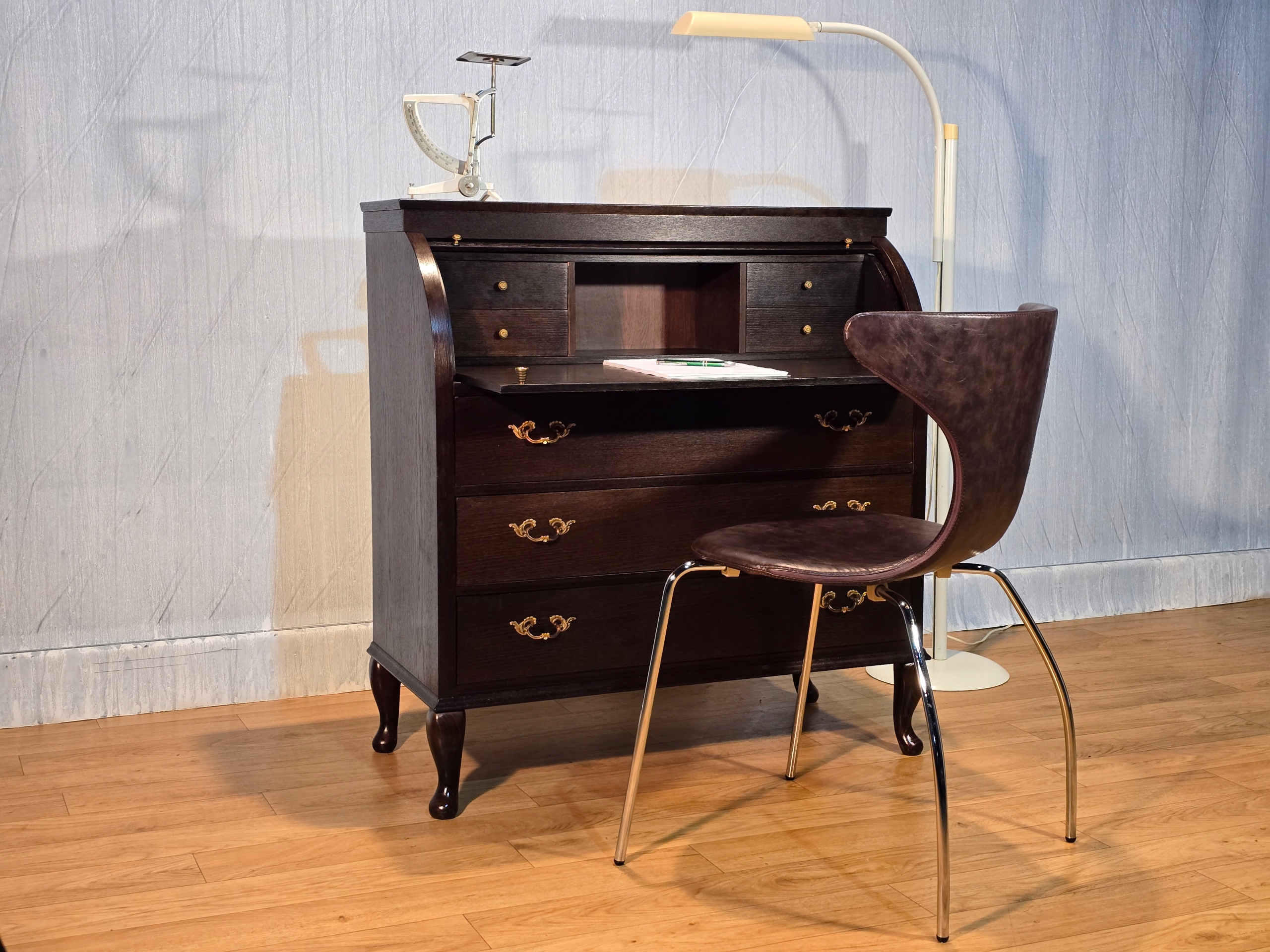 Секретарь, в дополнение к трем вместительным ящикам, имеет в верхней части меньшие ящики и перерывы, и все закрыто с помощью шарнирного, цилиндрического фронта, мебель имеет выдвижной верх, благодаря которой она действует как маленький стол.
