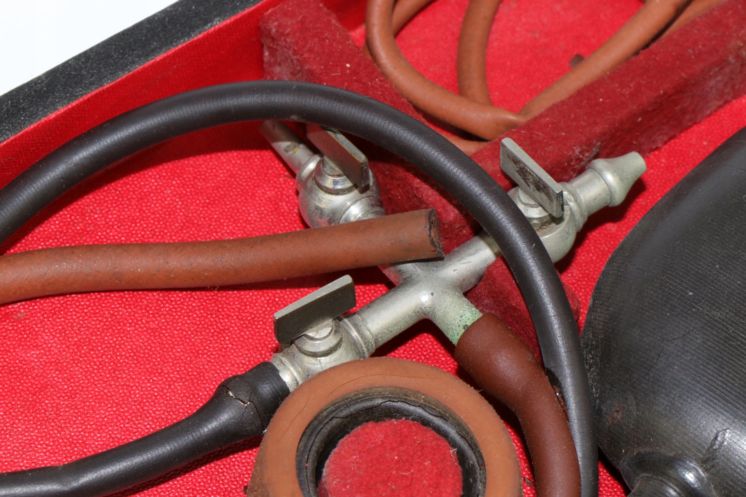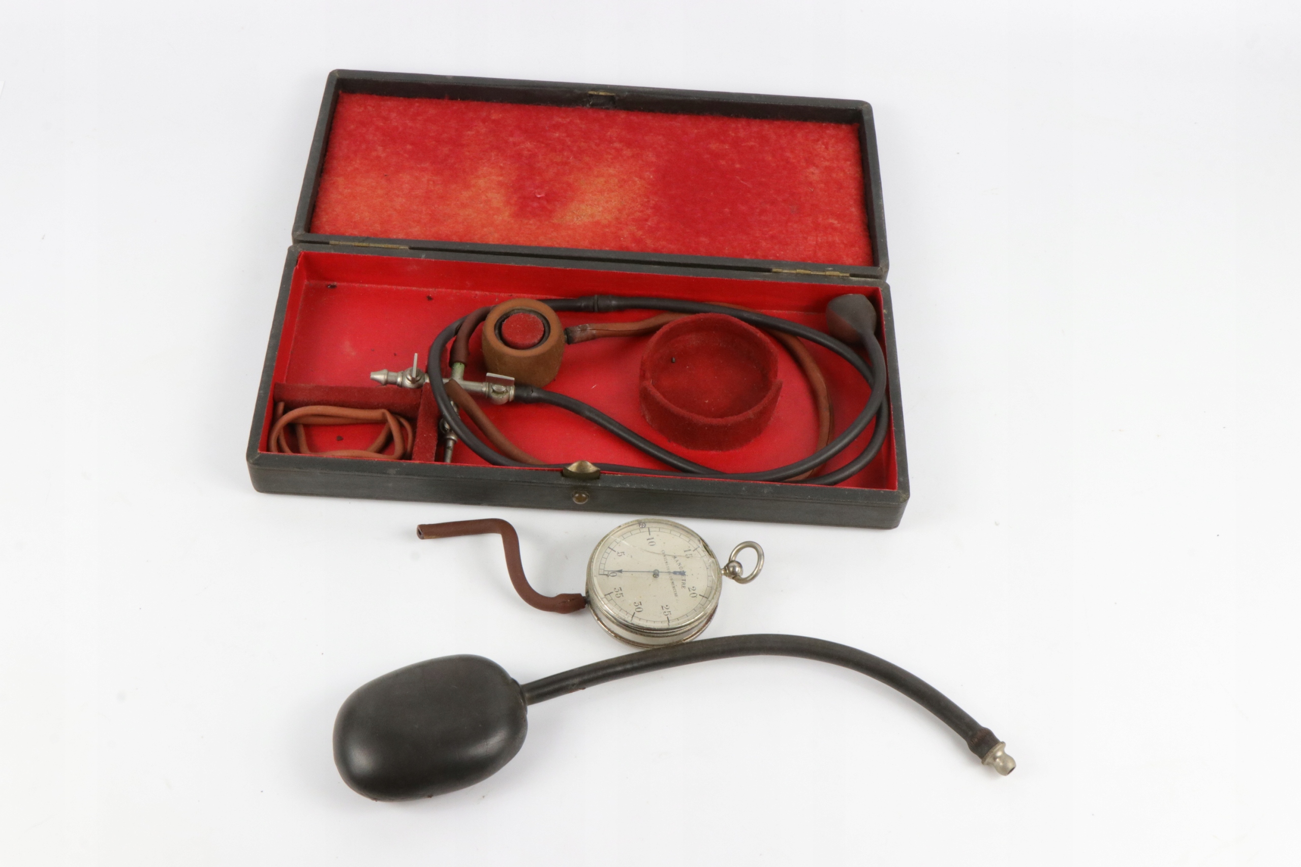Французский медицинский прибор сфигмоманометр, сфигмоманометр, прибор для непрямого измерения давления. Имя на футляре - доктор П. Булумье.