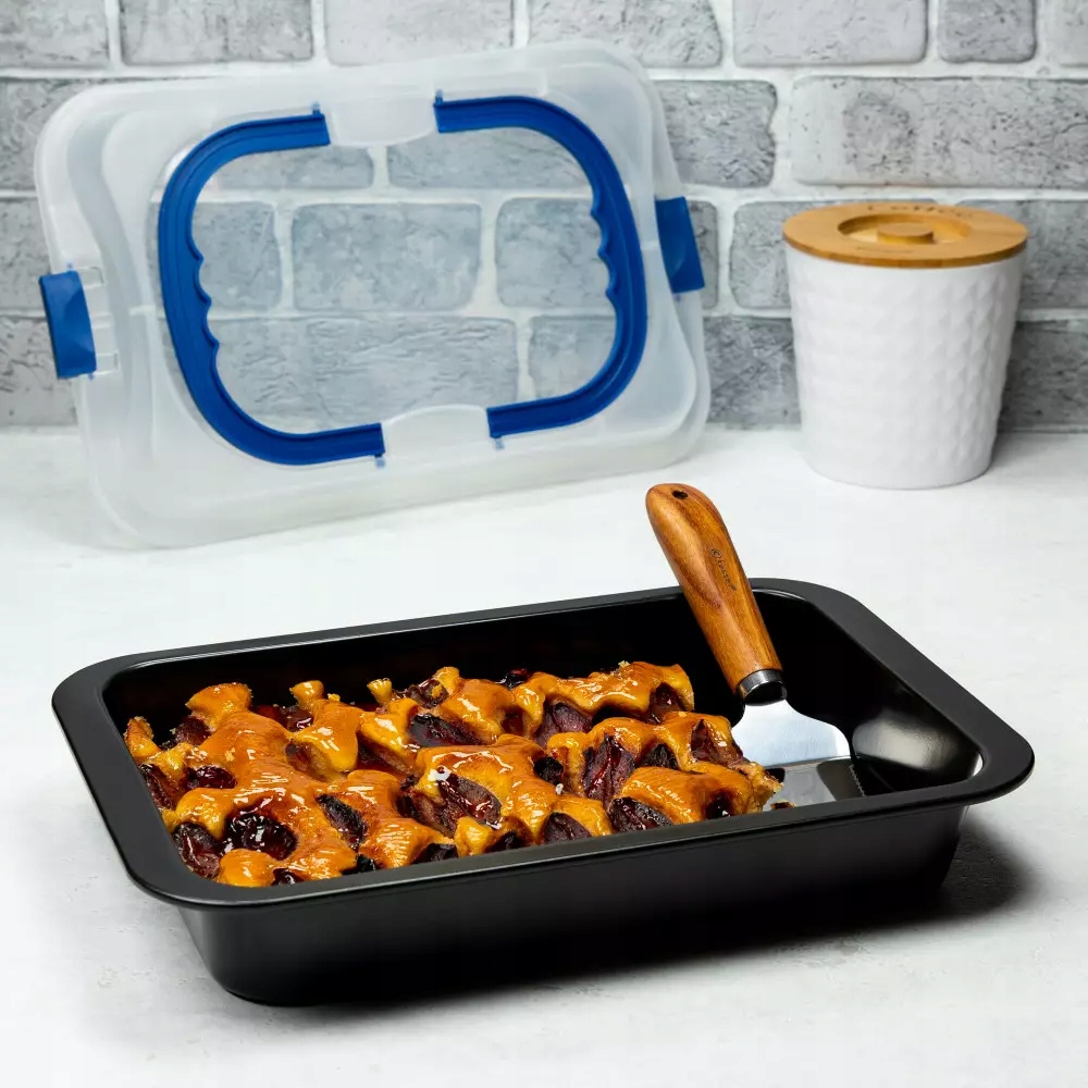Особенности: - Форма изготовлена из углеродистой стали, устойчивой к высоким температурам. - Крышка из пластика. - Температура и время выпекания – максимум 250°С, не более 2 часов. - Легко мыть, можно мыть в посудомоечной машине. - Размеры: 36 х 24,5 х 5,5 см