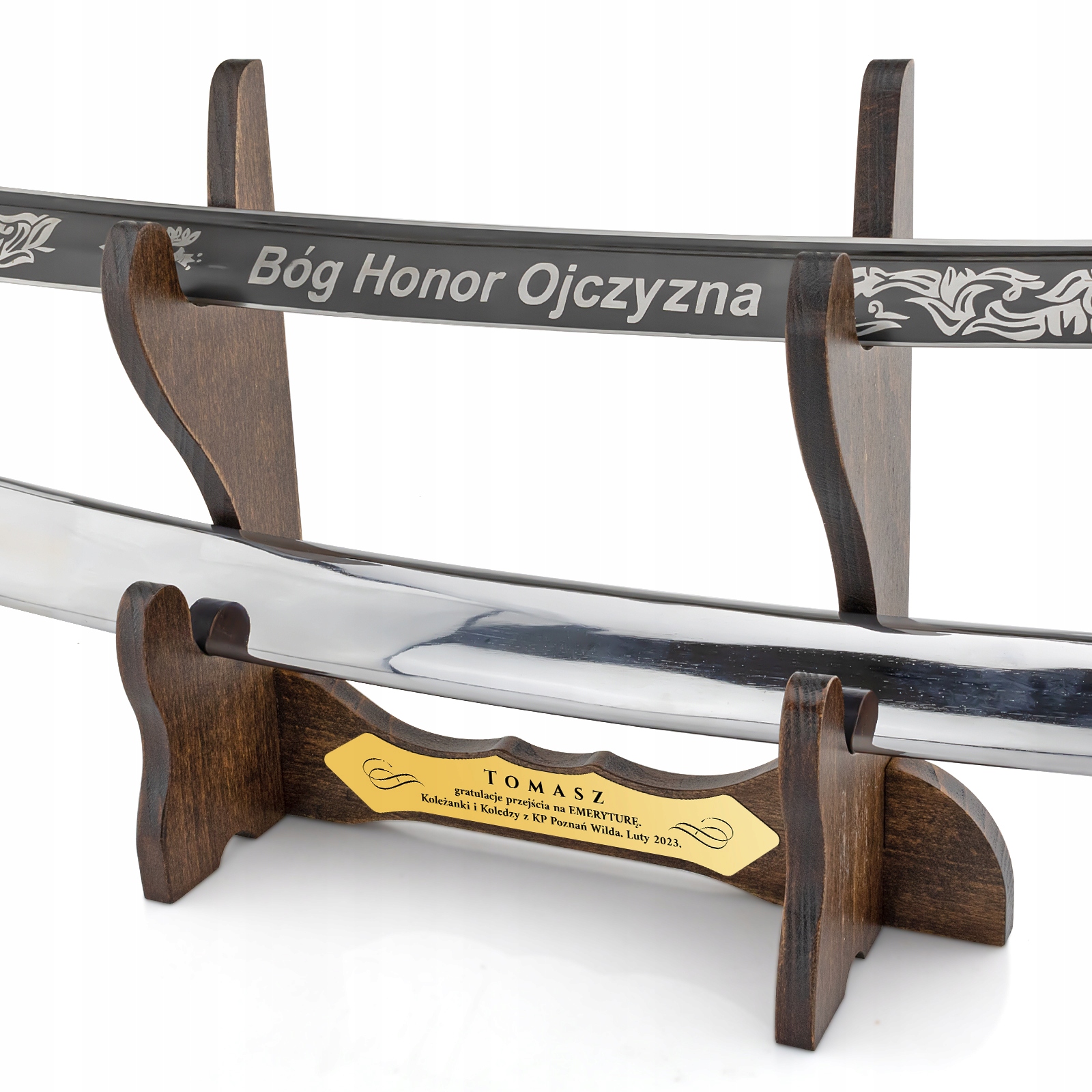 Точная копия сабли польского офицера 1921 года. с ножнами на деревянной подставке. Это прекрасная идея для подарка по случаю дня рождения, именина, юбилея или священного рукоположения. . Стол полностью деревянный, с местом для сабли и ножен. Рукоять сабли полностью закрытая, изготовлена из латуни и стилизована под голову орла. Голова изготовлена из толедской стали высочайшего качества, украшена красивым орнаментом, изображением орла в короне и надписью «God Honor Homeland». Рифленая ручка с витой латунной проволокой. Сабля не заточена и не предназначена для этой цели. Вместе с индивидуальной гравировкой он станет красивым и оригинальным украшением любого интерьера!