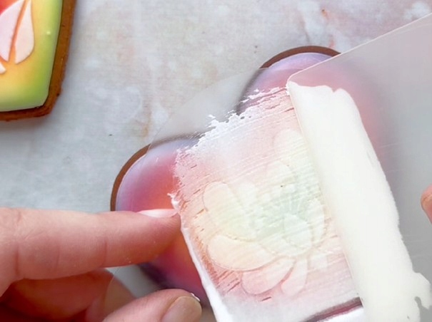 - С помощью лопаточки для глазури или ножа с гибким ножом твердым движением распределите глазурь по шаблону, закрывая все отверстия в нем;