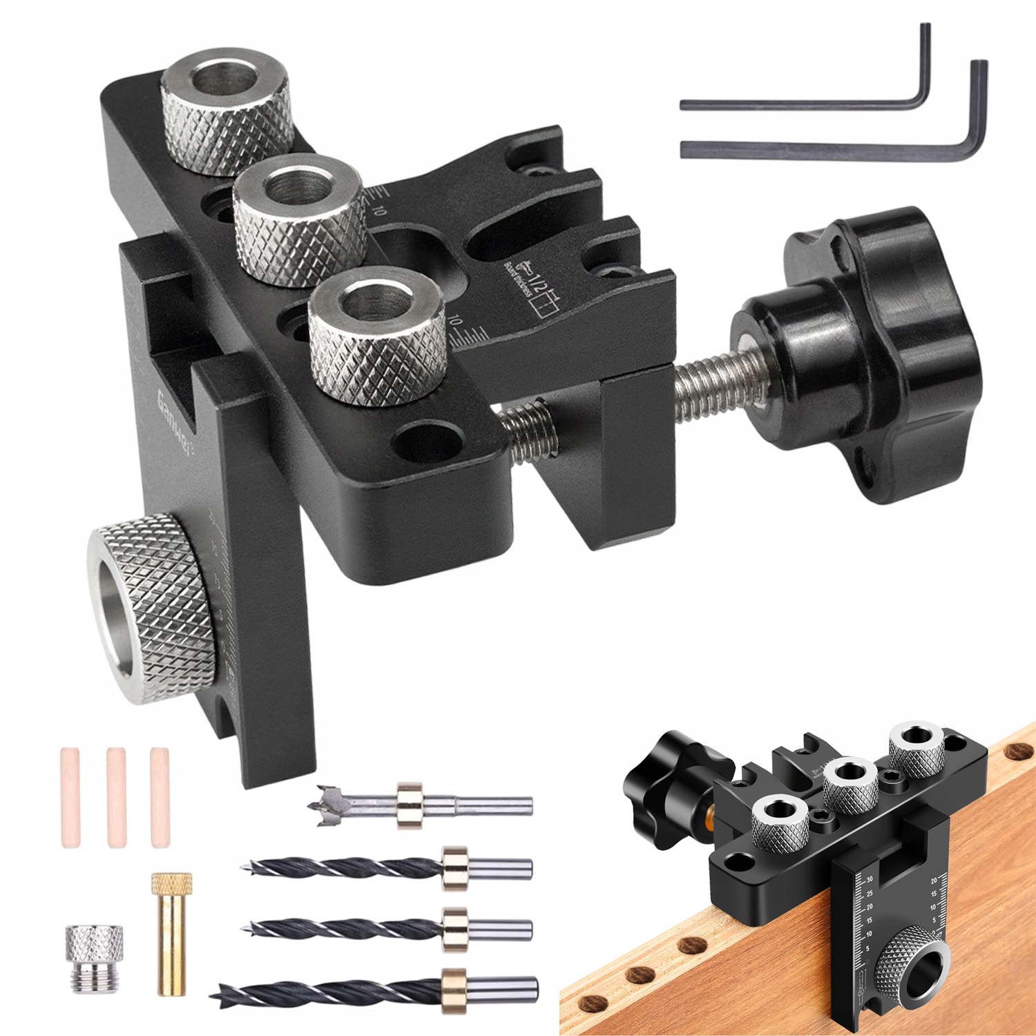 В комплект приспособлений для карманных отверстий входят 1 направляющая для сверла 3 в 1, 1 латунный стопорный блок, 4 сверла (10 мм/2 x 8 мм x 15 мм), 3 деревянных дюбеля, 2 шестигранных шестигранных ключа. 1 насадка для сверла 10 мм. Эта многофункциональная направляющая 3-в-1 специально разработана для дюбелей. и Вертикальная Шер.