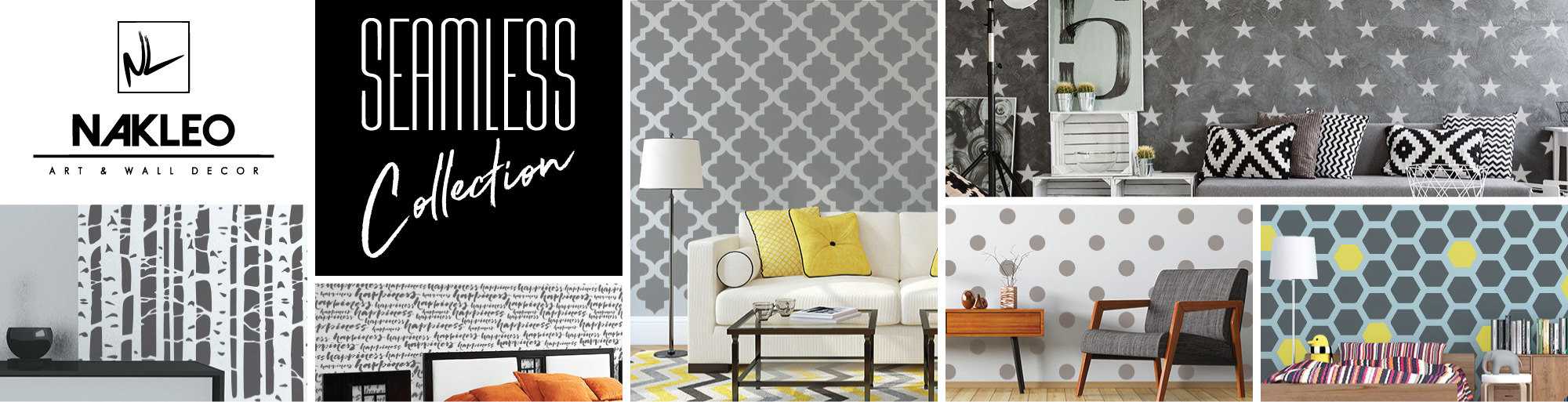 Nakleo Seamless Collection — это многоразовые трафареты для рисования, изготовленные из прочного полупрозрачного пластика. Каждый набор состоит из основного трафарета размером 95х59см и одного, двух или трех трафаретов меньшего размера для прорисовки труднодоступных мест и углов. Трафареты можно использовать столько раз, сколько вы захотите, поэтому вы можете легко покрыть даже самые большие стены любой композицией узоров и цветов, получив эффект обоев за небольшую часть их цены.