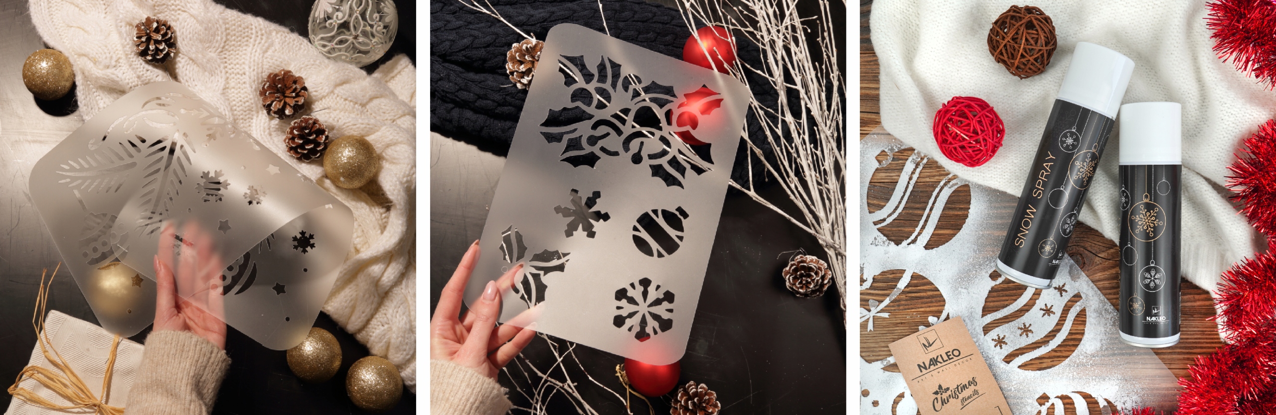 Серия Nakleo Christmas Collection состоит из трафаретов для рисования из прочного пластика, предназначенных для составления уникальных рождественских украшений. Каждый шаблон доступен в 2 размерах на выбор: 21×45 см и 45×95 см (доступен на другом аукционе) с различными рождественскими узорами. Просто используйте искусственный снег, блестки, серебряную или золотую краску или любое другое новогоднее украшение и перекрасьте узор!