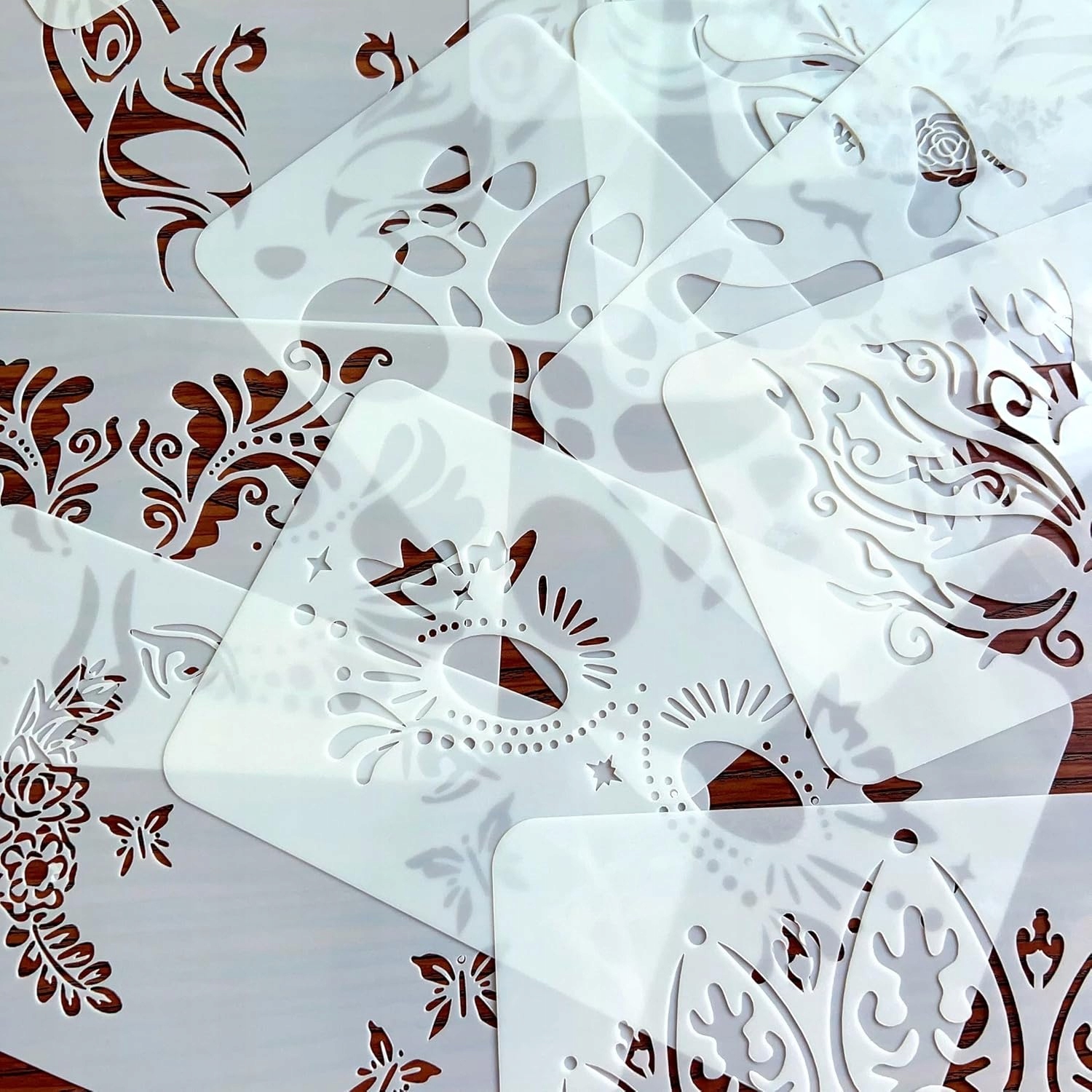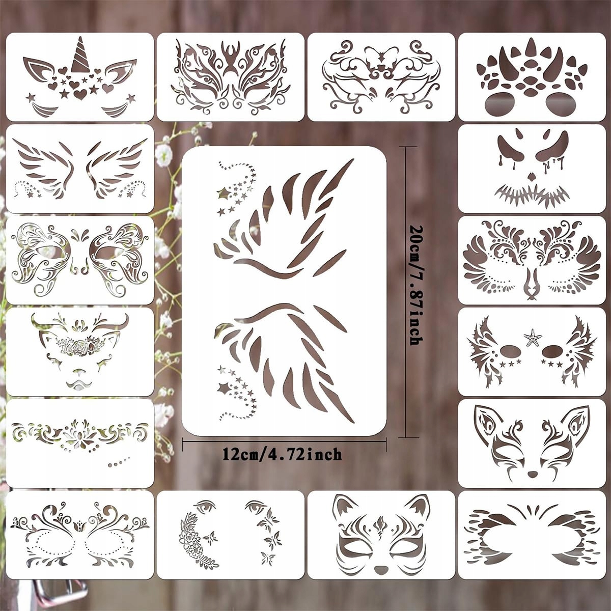 3. 【Различные дизайны】 Каждый шаблон имеет размеры 20 x 12 x 0,2 см и доступен в 16 различных узорах. Эти трафареты для рисования лица идеально подходят для индивидуальной и групповой работы, восхищая художников как молодых, так и старых.
