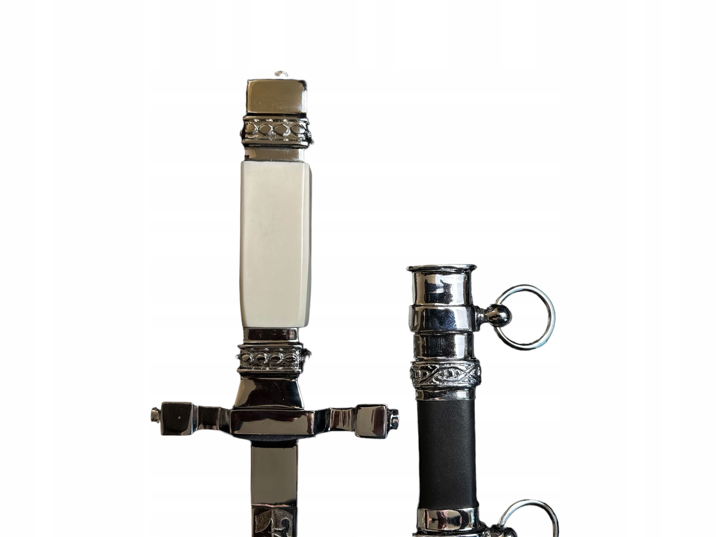 Полированное никелированное лезвие из высокоуглеродистой стали с ромбовидным сечением. Длинный лад, центральная гравировка. На внешней поверхности выгравирован орнамент с изображением государственного герба и надписью «Честь и Родина». Перекладина прямого профиля с центральным расширением и четырехсторонними выступами. Сечения крестовины четырехгранные, за исключением полукруглых концов плеч. Нижнее кольцо древка четырехгранное, расширенное внизу декоративным кольцом вверху с орнаментом. Рукоять белая, прямоугольная, с поперечным сечением и закругленными краями. Голова с декоративным кольцом с орнаментом. Металлические элементы: ручки из никелированной стали. Ножны овального сечения из дерева, с черной кожаной оболочкой и тремя фурнитурами из никелированной стали. Верхняя фурнитура с арочной входной манжетой, гладким желобком со звеном и подвижным опорным колесом, внизу декоративным кольцом с орнаментом. Центральный штуцер с пазом, украшенным орнаментом, со звеном и подвижным опорным колесом. Нижняя часть штуцера - туфелька с декоративным кольцом с орнаментом из лаврового листа с плоским концом и расположенной на нем уплощенной шишечкой.