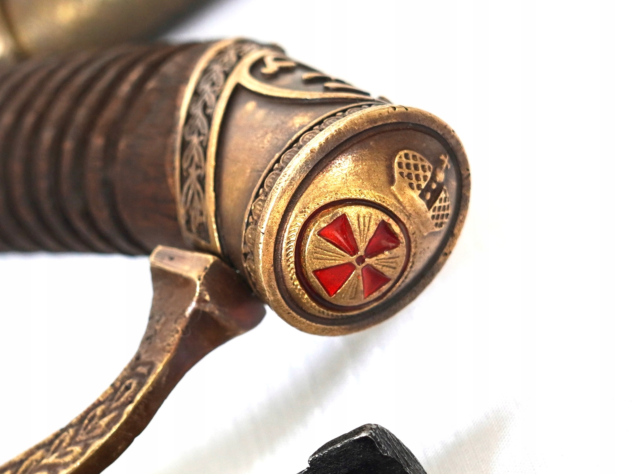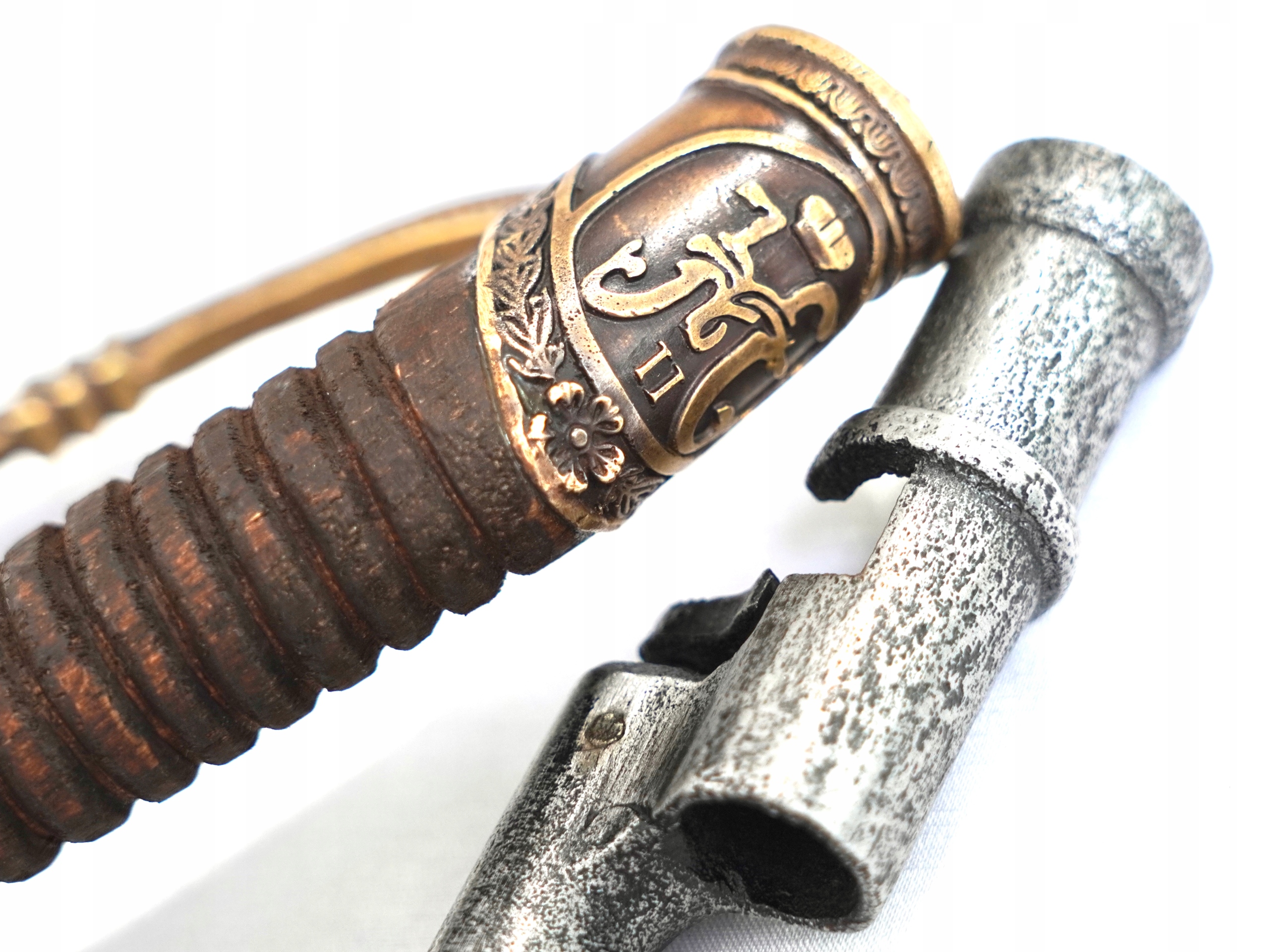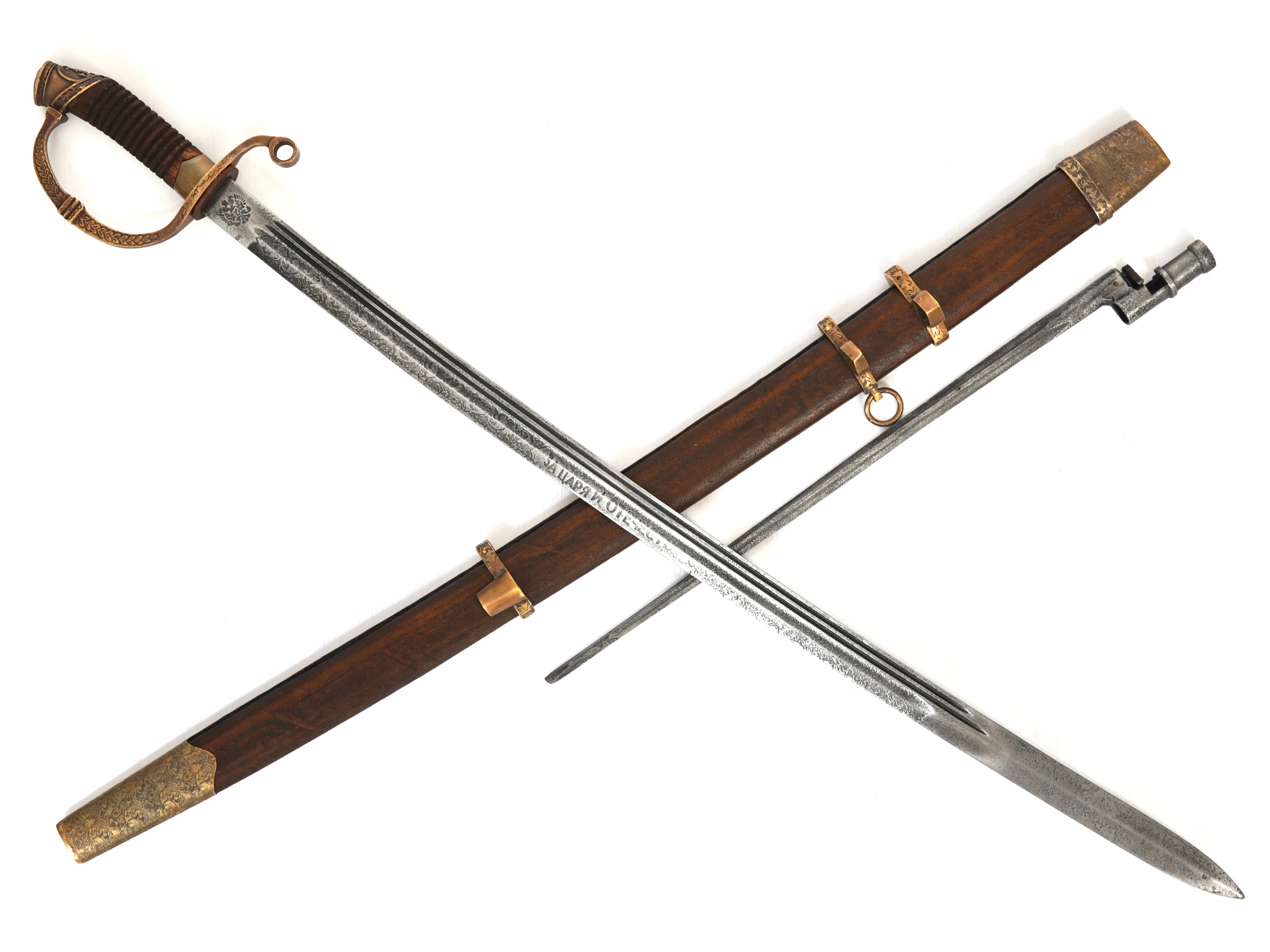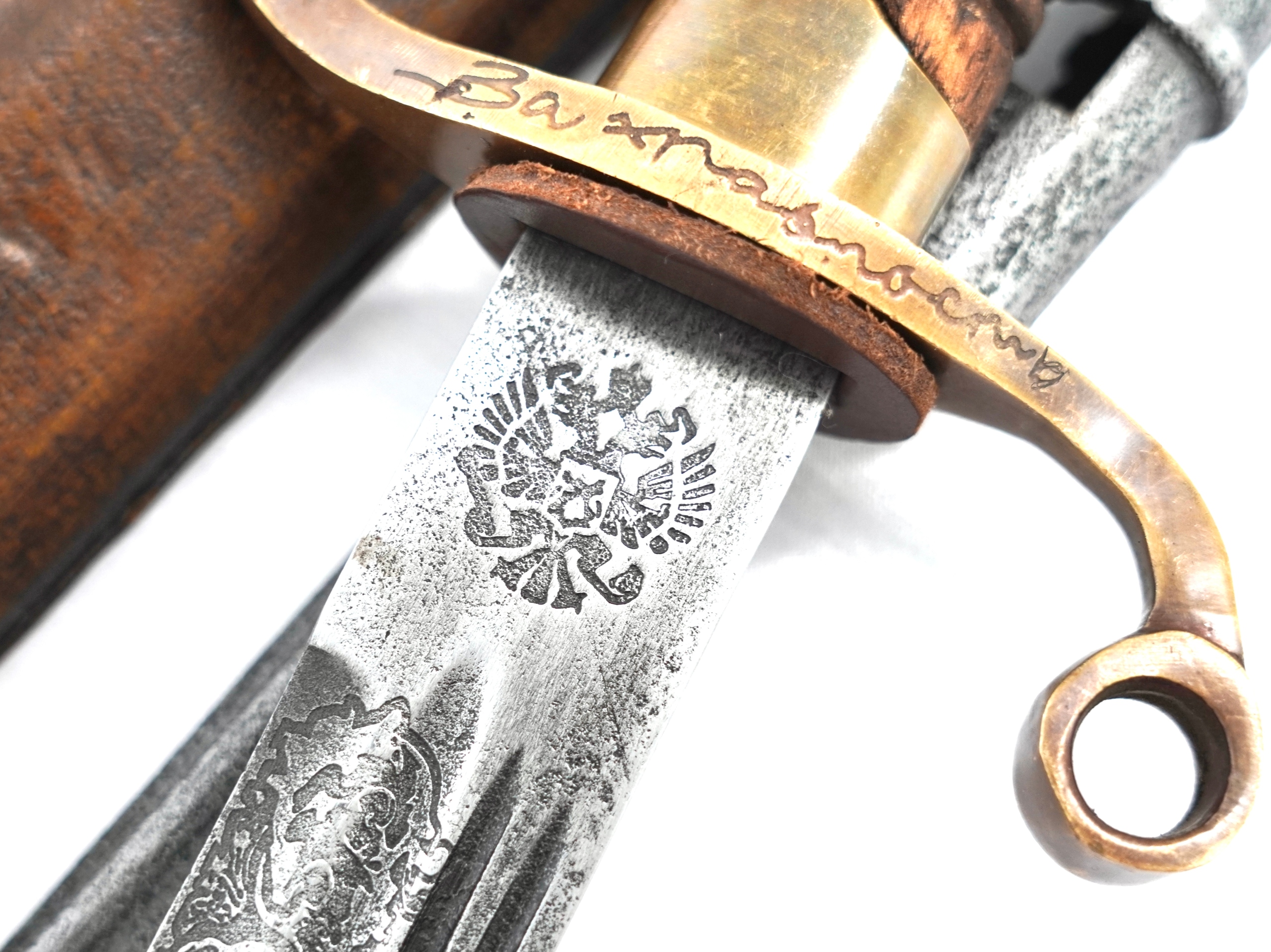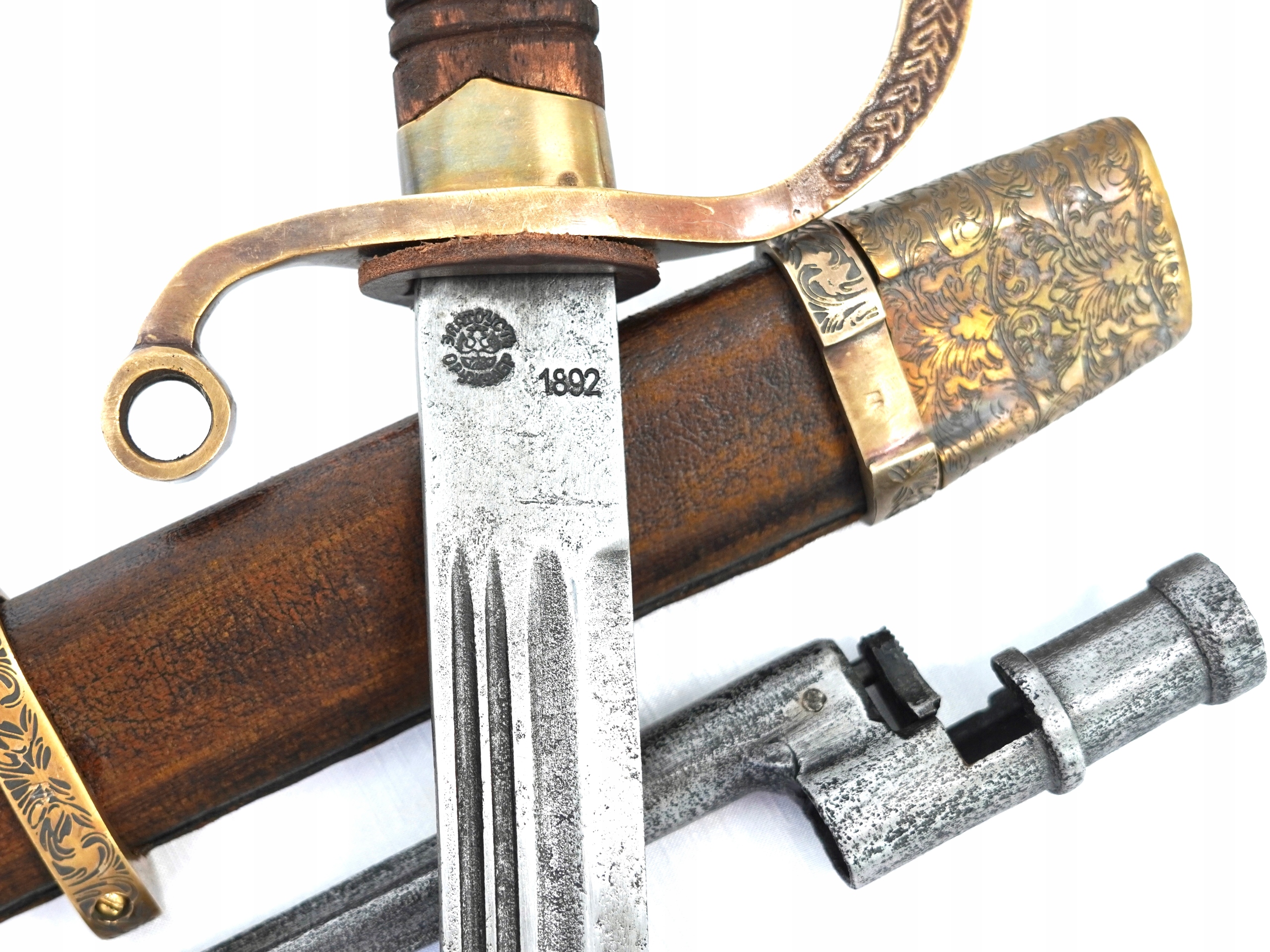 Представляемая нами сабля подписана в месте соединения клинка с рукояткой. Нанесены клейма Златоустовской Оружейной Фабрики, русский орел со скипетром и державой, год 1892. Кроме того, на латунном элементе высечена надпись «За храбрость». храбрость". Лезвие изготовлено из высококачественной незакаленной стали. На правом клинке девиз «За царя и отечество», что переводится как «За царя и Отечество». Ручка деревянная, с насечками. На колпаке (в нижней части рукоятки) размещен орден Святой Анны (красный эмалированный крест) с закрытой короной, а также знак отличия царя Николая II. Красиво украшенная растительным мотивом латунная гарда служит для защиты руки в бою, а также укрепляет саблю. Ножны деревянные, обтянутые кожей. Латунная фурнитура, также украшенная растительным узором. На латунных элементах имеется характерная буква М. На ножнах имеется один паз с кольцом и элементами, удерживающими штык к винтовке Мосина. Байонетный замок рабочий. Вся вещь выполнена в стиле старинной сабли, фабрично состаренной. Держа его в руках, мы можем ощутить истинный дух ушедшей эпохи рукопашных войн.