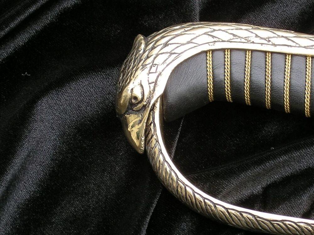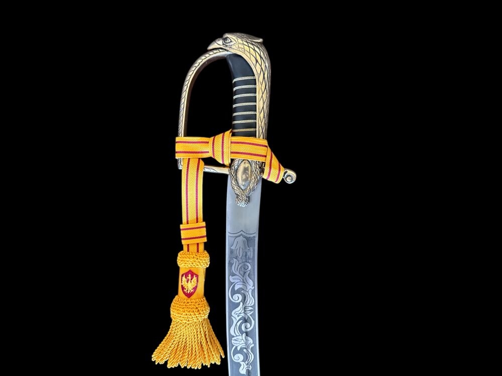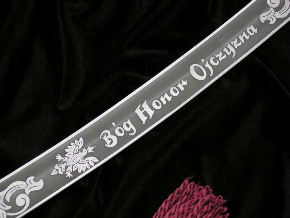 Вес: около 1,1 кг .Эта копия отличается главным образом исходной формой капюшона в виде головы орла и JELC, украшенного в мотиве плетеного шнура. Ручка ручки, покрытая черной кожей. Декоративный строп был прикреплен к луку. Клинок украшен польской символикой и популярной патриотической надписью? Боже, честь родина.