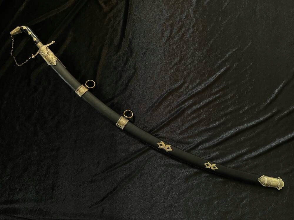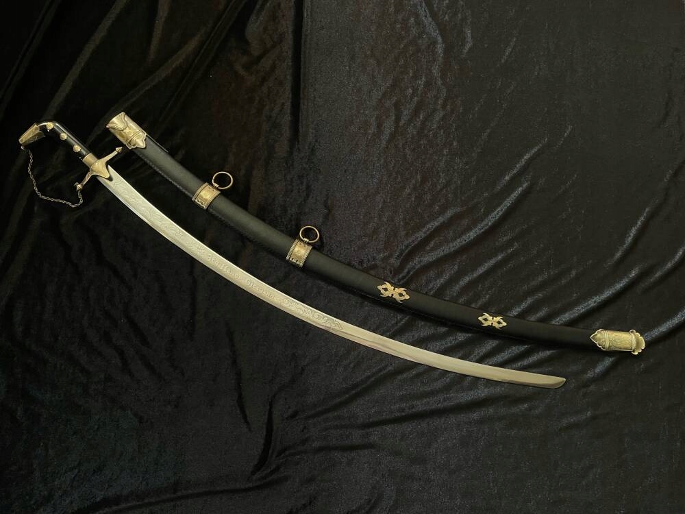 На клинке красивый растительный орнамент. изображения орла с короной и гравировкой: Боже, Родину Славь