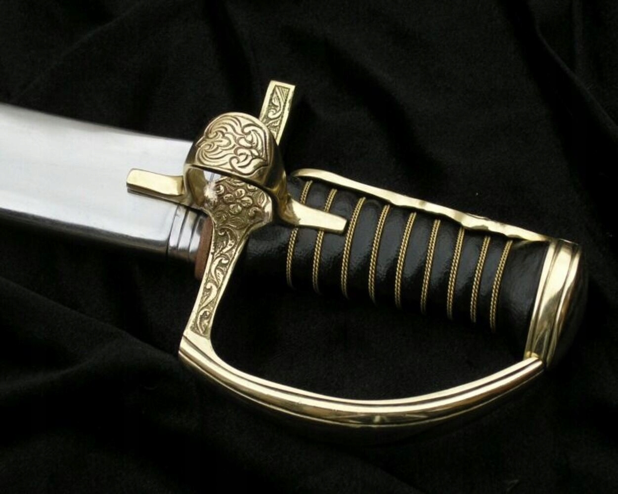Рукоять деревянная, с крестообразным насечком, обтянутая черной кожей, с оплеткой из латунной двойной крученой филиграни. Лезвие из полированной стали, большой кривизны, заточено с обеих сторон в один дол.