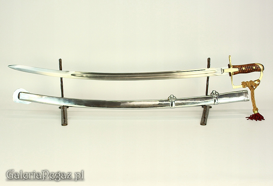 Токарная деревянная рукоять с продольными бороздками облегчает удержание тяжелой сабли в руке. Крестовина изготовлена из полированной латуни. Полированные хромированные ножны имеют два кольца.