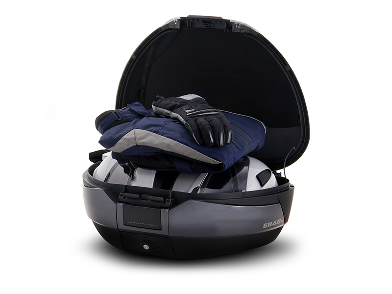 Модель SH48 имеет объем до 48 литров, что позволяет перевозить два полнолицевых шлема и аксессуаров или действительно большое количество другого багажа общим весом 8 кг. В сочетании с водонепроницаемой конструкцией это идеальное решение для людей, которые много путешествуют или для тех, кто, например, не может (или не хочет) брать с собой шлем, куртку или другие вещи после парковки мотоцикла или скутера.