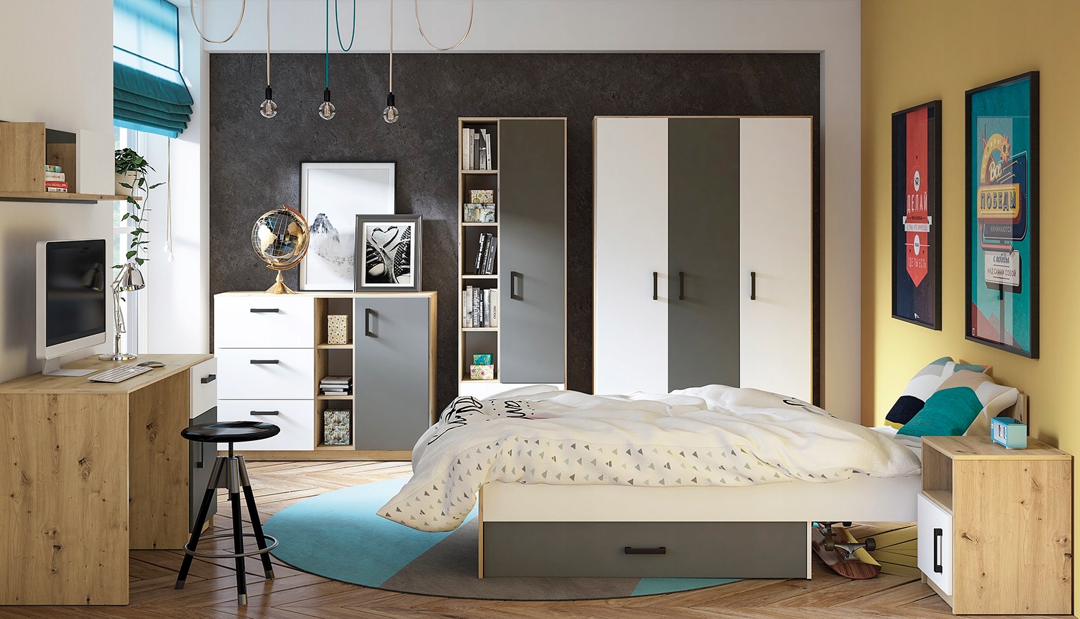 система состоит из: шкафы, комоды, полки, письменный стол, полка, кровать, тумбочка