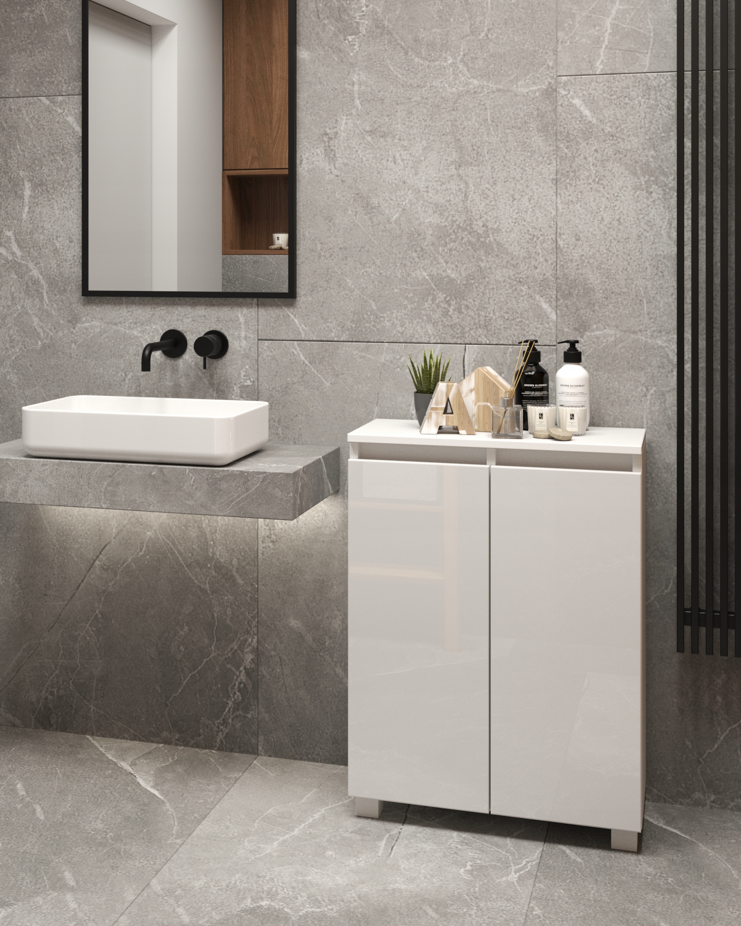 - шкаф можно поставить в ванной на ножках или повесить на стену с помощью регулируемых вешалок