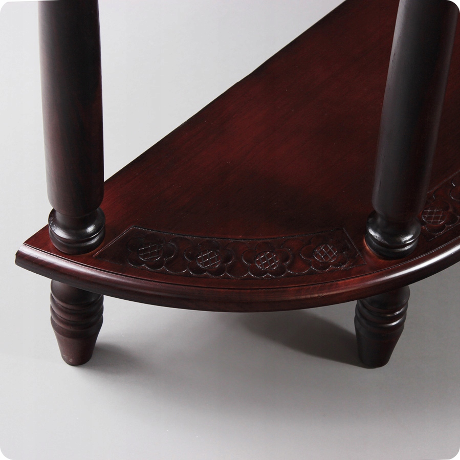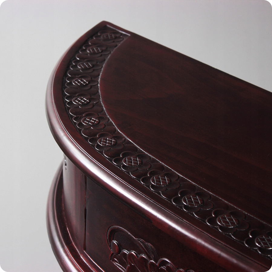 Представляем настенную полукруглую консоль из темного красного дерева. Консоль имеет резной верхний и нижний стол. В центральной части, под столешницей, есть выдвижной ящик. Консоль очень практична и выглядит стильно.